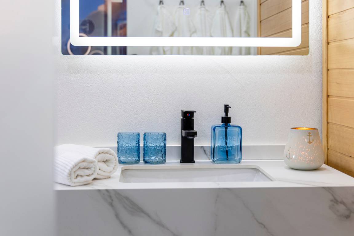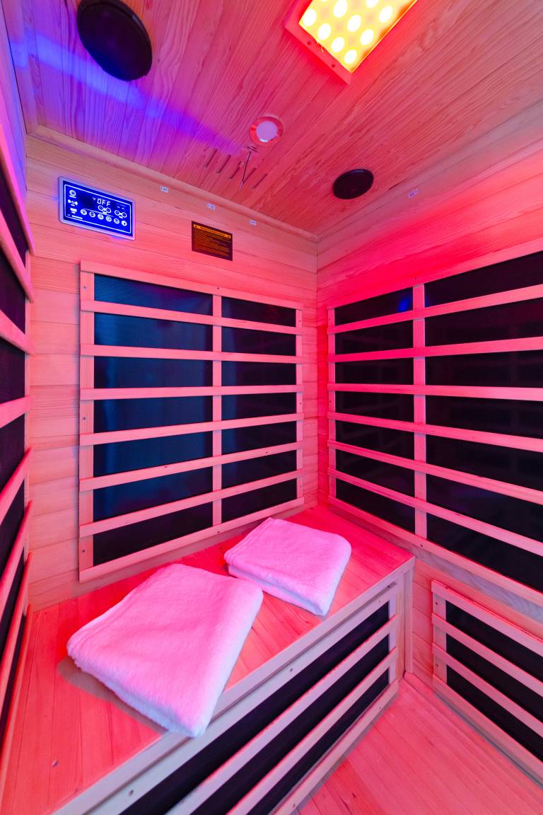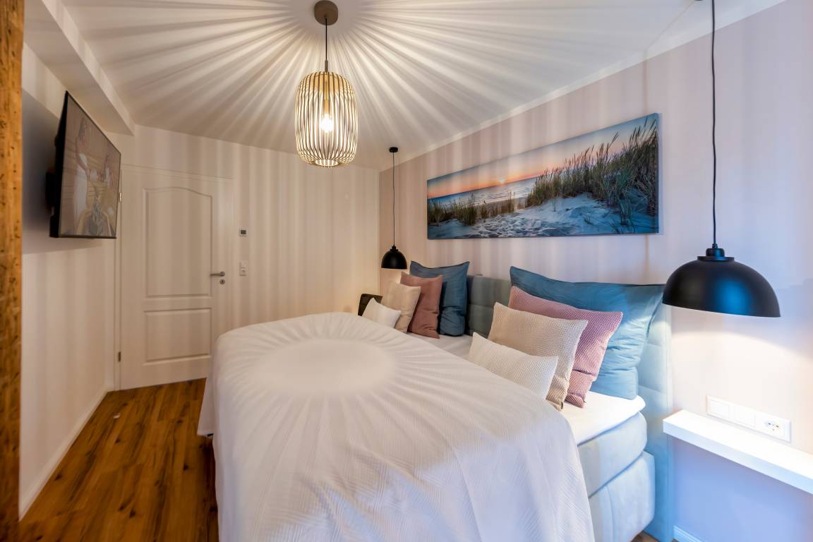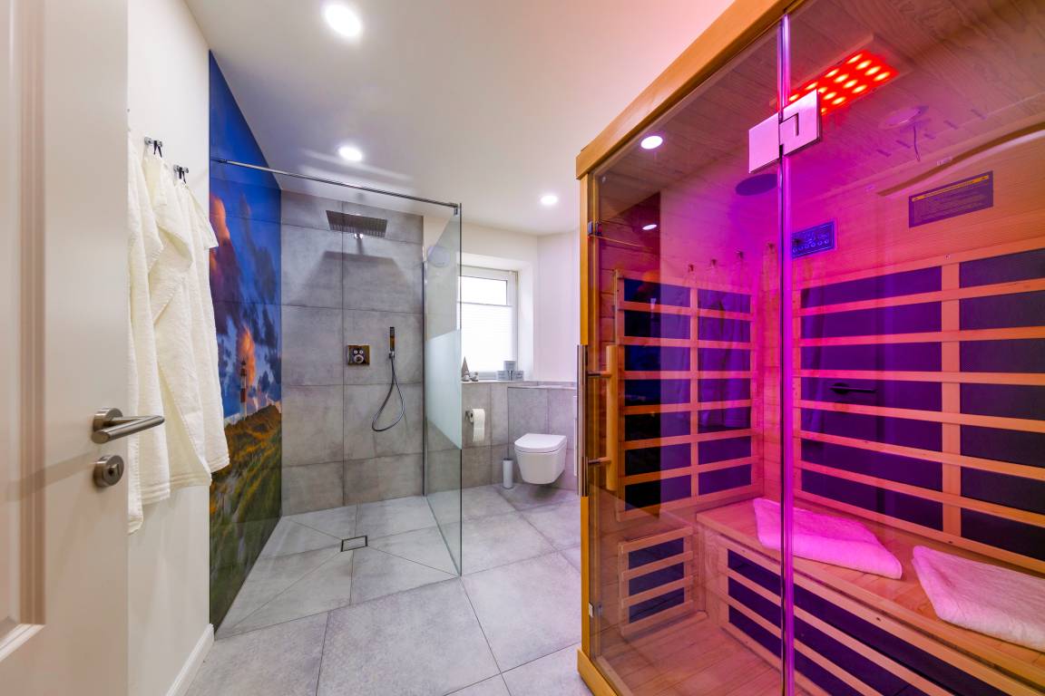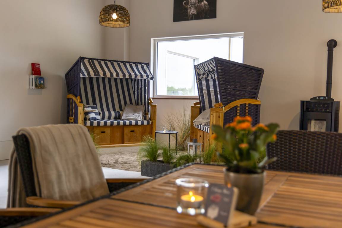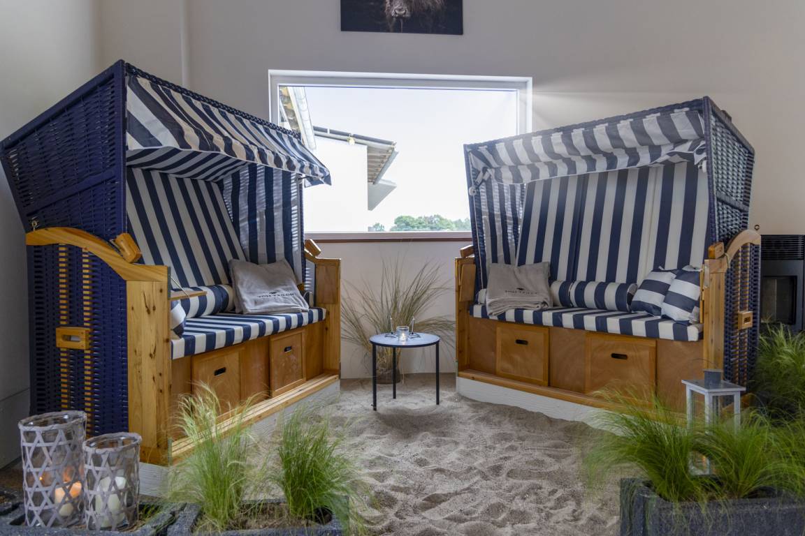 Eine Fußbodenheizung sorgt im ganzen Haus für wohlige Wärme und eine Klimaanlage rundet das ganze ab. In den stilvollen Bädern finden Sie bodengleiche Duschen und Infrarotkabinen, die nach einem erfrischenden Tag an der Nordsee zum Aufwärmen einladen. Genießen Sie ein Glas Wein bei Kerzenschein und entspannen Sie anschließend im bequemen Boxspringbett, vielleicht mit einem Film auf dem großen Flachbildfernseher.