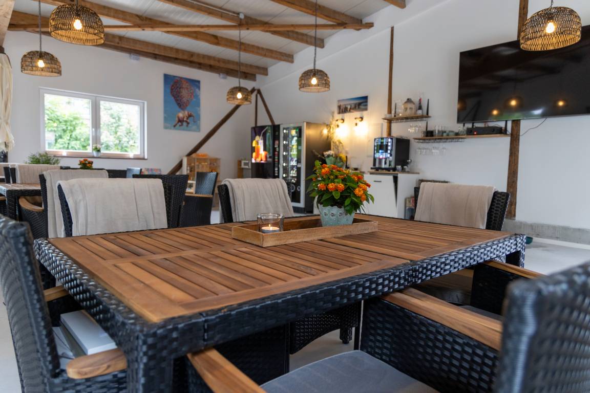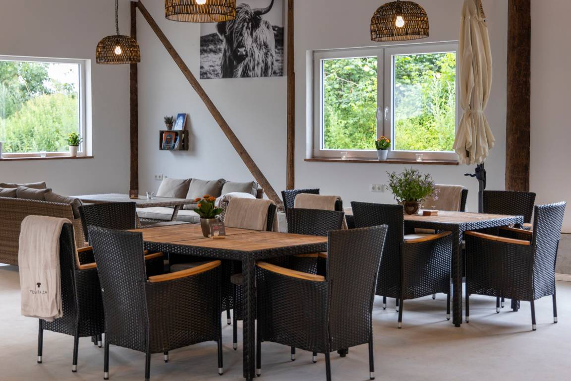 Unser Außengelände ist ebenso einladend gestaltet: Grillplätze laden zu gemütlichen Abenden im Freien ein, während Mini Shettys und Ziegen auf den Weiden grasen. Für Ihre Vierbeiner gibt es einen eingezäunten Hundefreilauf neben dem Grillplatz, sodass auch sie einen erholsamen Tag genießen können. Sollte das Wetter einmal nicht mitspielen, bietet unsere Aufenthaltshalle genügend Platz für unsere Feriengäste. Hier können Sie Snacks sowie Kalt- und Heißgetränke erwerben, und für die kleinen Besucher gibt es eine liebevoll eingerichtete Spielecke.