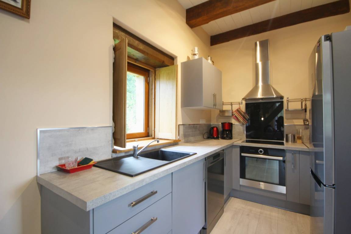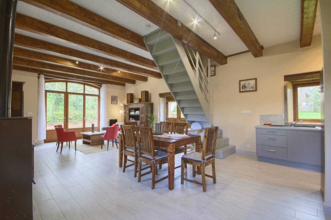 - Das Erdgeschoss bietet ein großes Wohnzimmer mit voll ausgestatteter Küche, Wohnzimmer und Aufenthaltsraum (Ofenheizung + elektrische Zusatzheizung) sowie ein Duschbad mit WC.