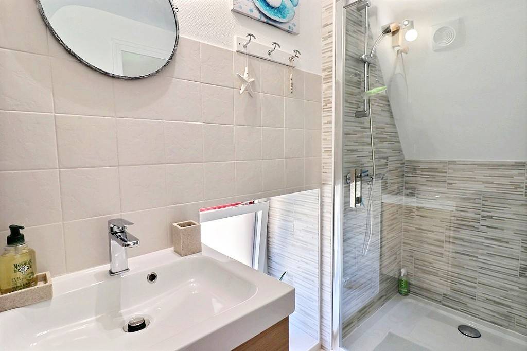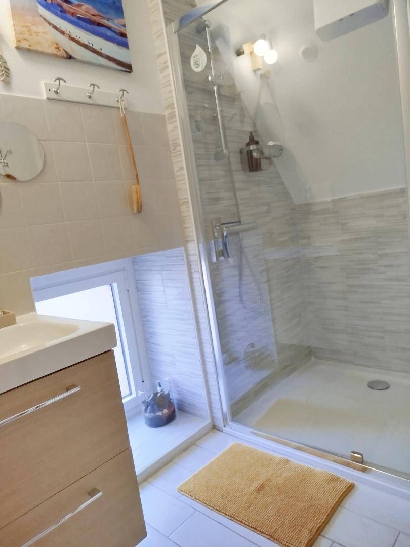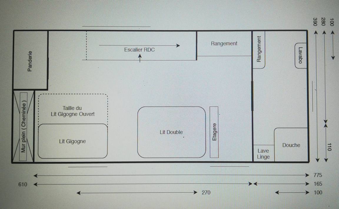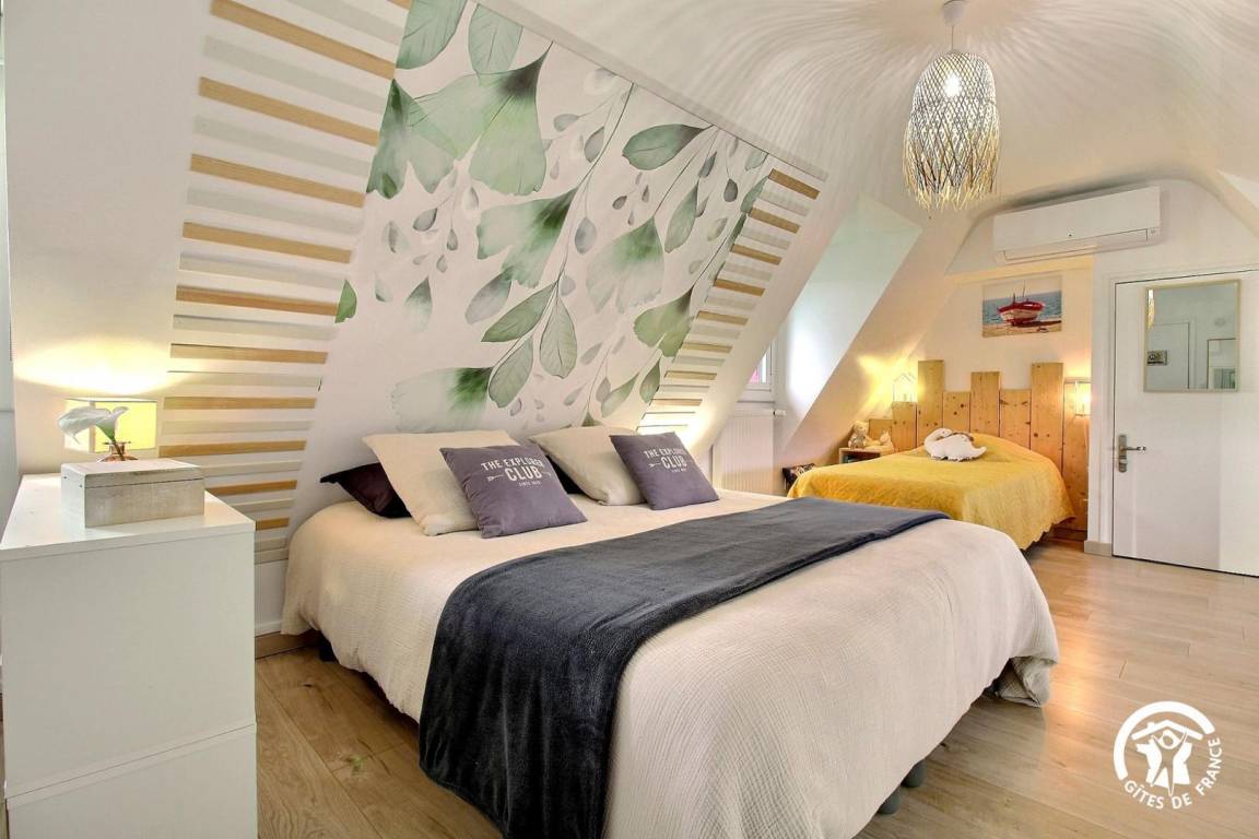-Im 1. Stock: ein Schlafzimmer im Zwischengeschoss mit 1 Bett 160x200 und 2 Betten 90 (davon 1 Ausziehbett) und ein Badezimmer. Möglicher Empfang von 2 Personen mit Zuschlag (Schlafcouch).