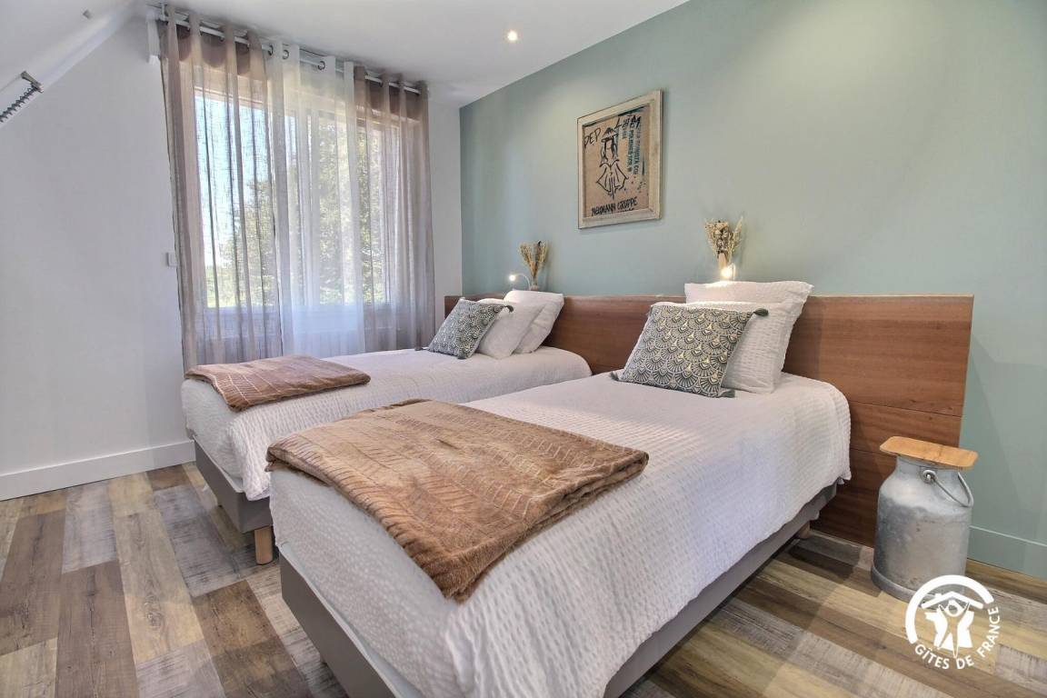Ein Schlafzimmer mit zwei 90 x 200 cm großen Betten (können zu einem 180 x 200 cm großen Bett zusammengestellt werden)