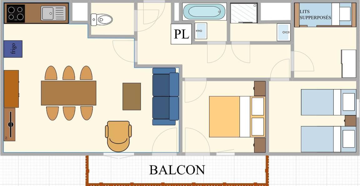 Fläche von ungefähr 48 m². 4te Etage. Orientierung : West. Wohnzimmer mit Ausziehschlafcouch für 2 Personen. Schlafzimmer mit Doppelbett. Schlafzimmer mit 2 Einzelbetten. Schlafzimmer mit 2 Stockbetten. Kochnische mit Mikrowellengrill, Geschirrspülmaschine, Herdplatten, Kühlschrank. Badezimmer mit Badewanne. Waschräume mit Dusche. separates WC. Balkon. Die oberen Betten sind nicht für Kinder unter 6 Jahren geeignet.