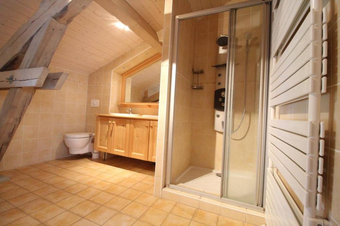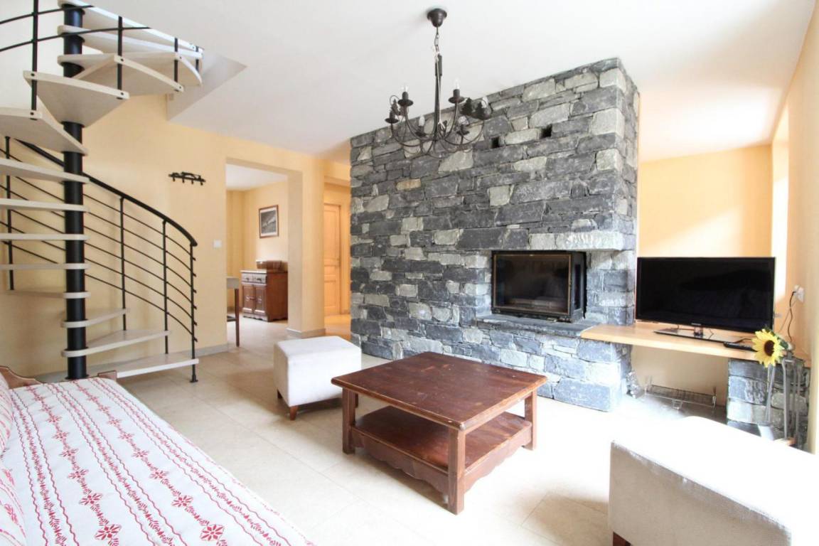 Fläche von ungefähr 110 m². 2te Etage. Orientierung : Süd. Blick dorf und Berg. Wohnzimmer mit Ausziehschlafcouch für 2 Personen, Kamin. Zwischengeschoss mit Ausziehschlafcouch für 2 Personen. 2 Schlafzimmer mit 2 Einzelbetten. Schlafzimmer mit Doppelbett. Kochnische mit Backofen, Waschmaschine, Geschirrspülmaschine, Mikrowellenherd, Glaskeramikkochfelder, Kühl-Gefrier-Kombination. 2 Badezimmer mit Dusche. separates WC. Balkon.
