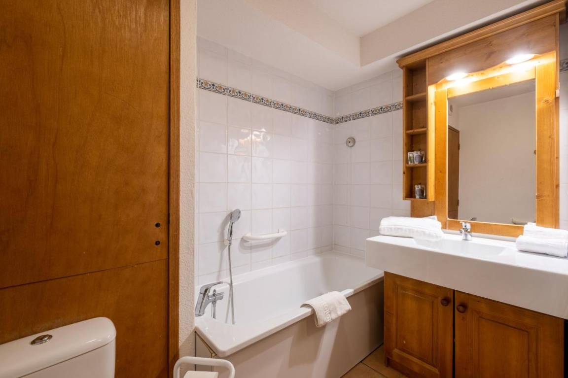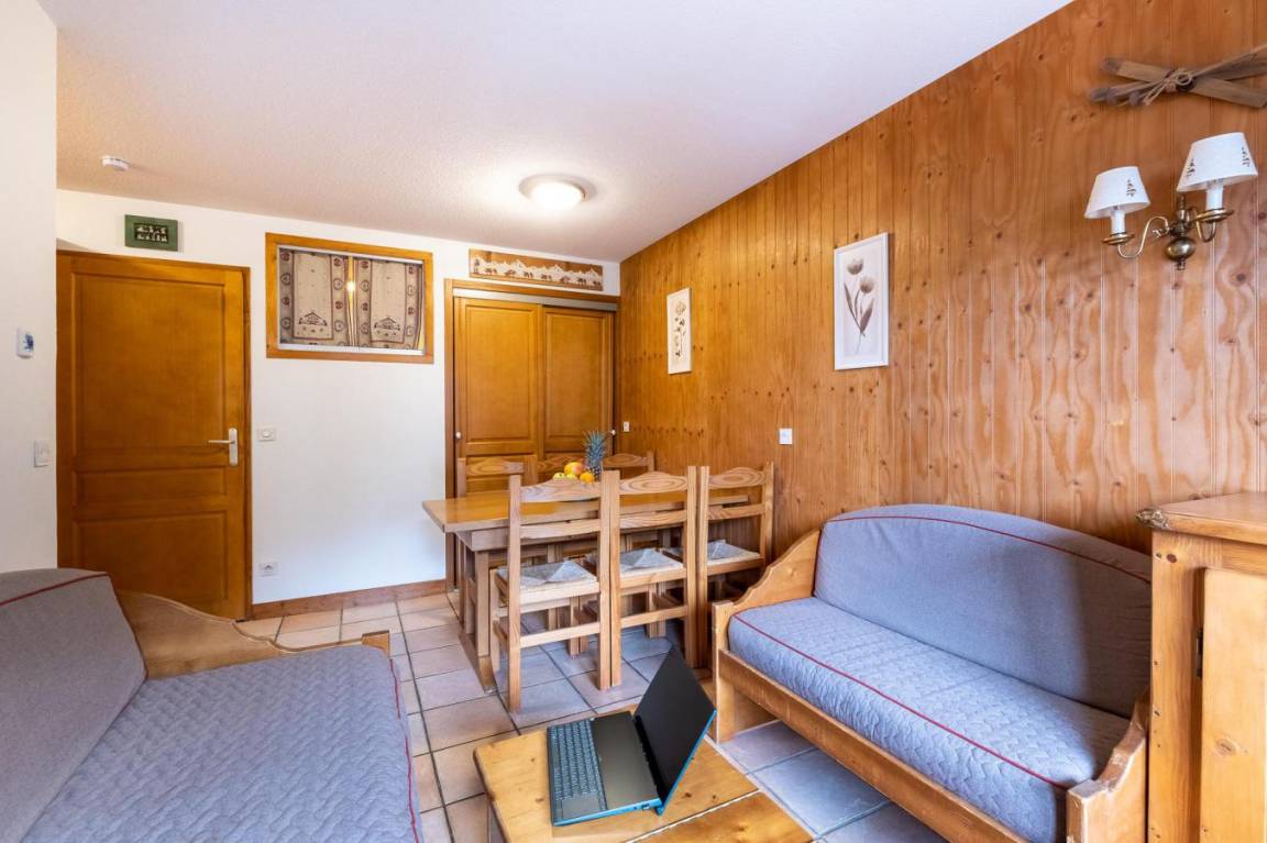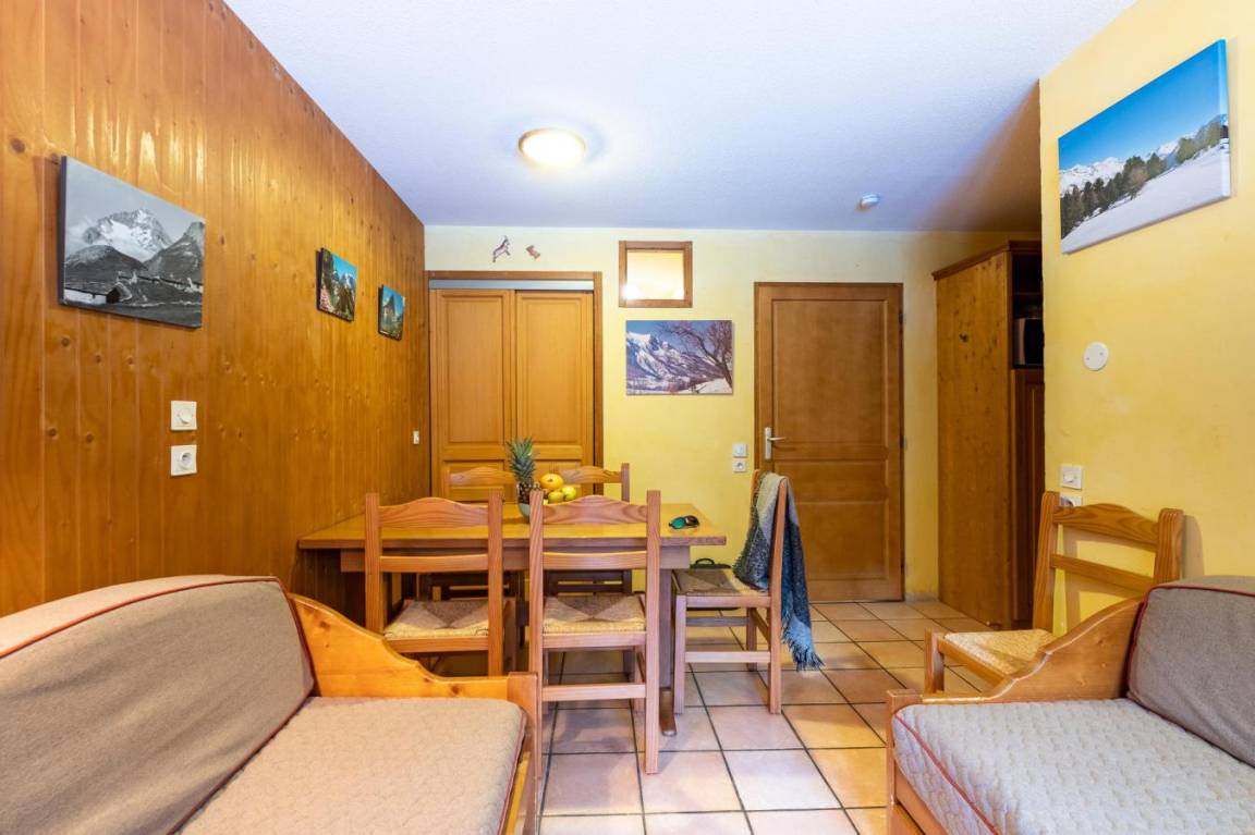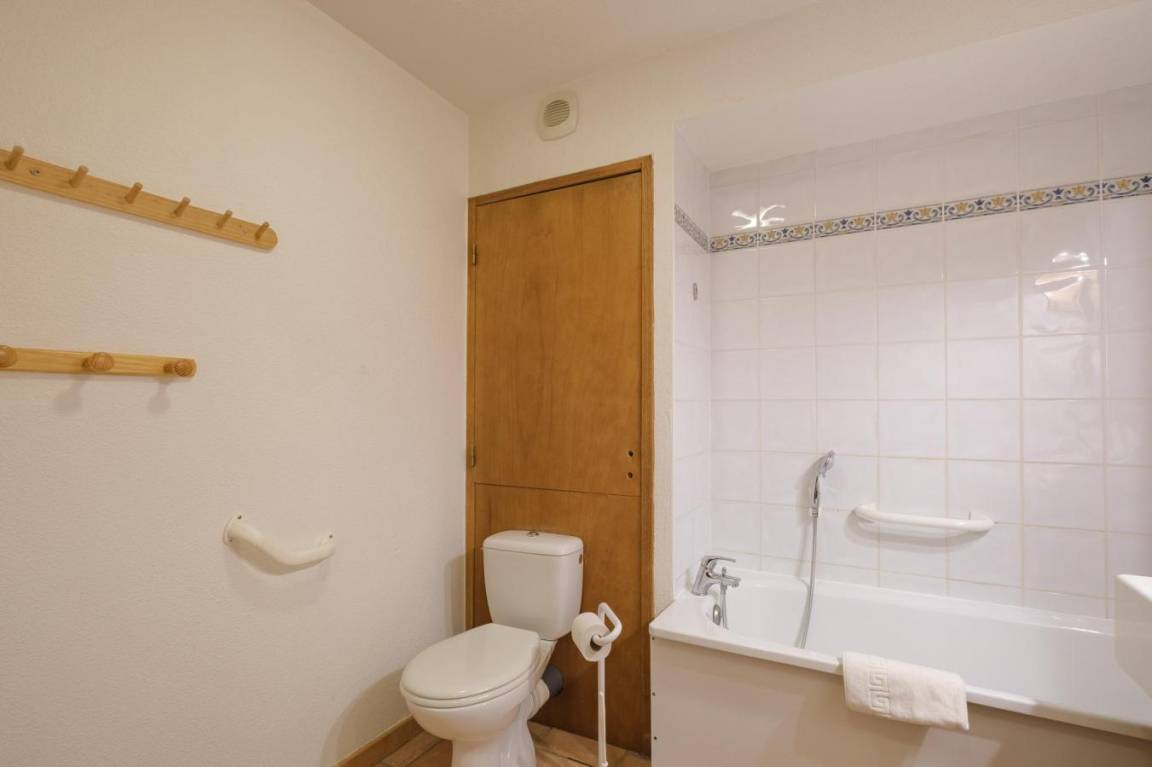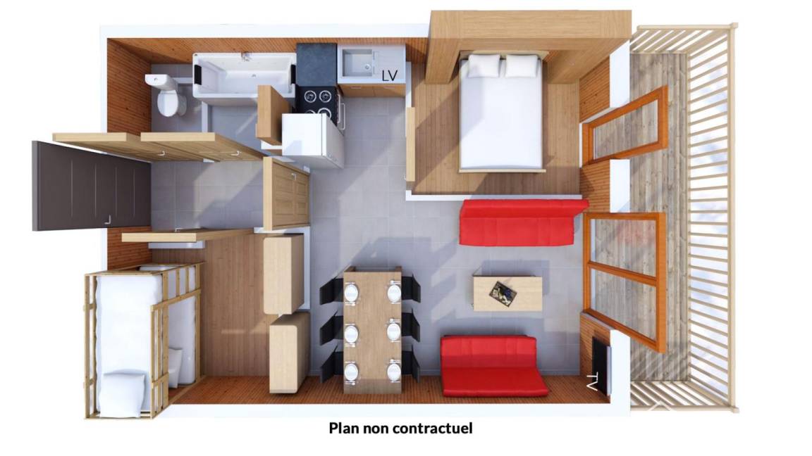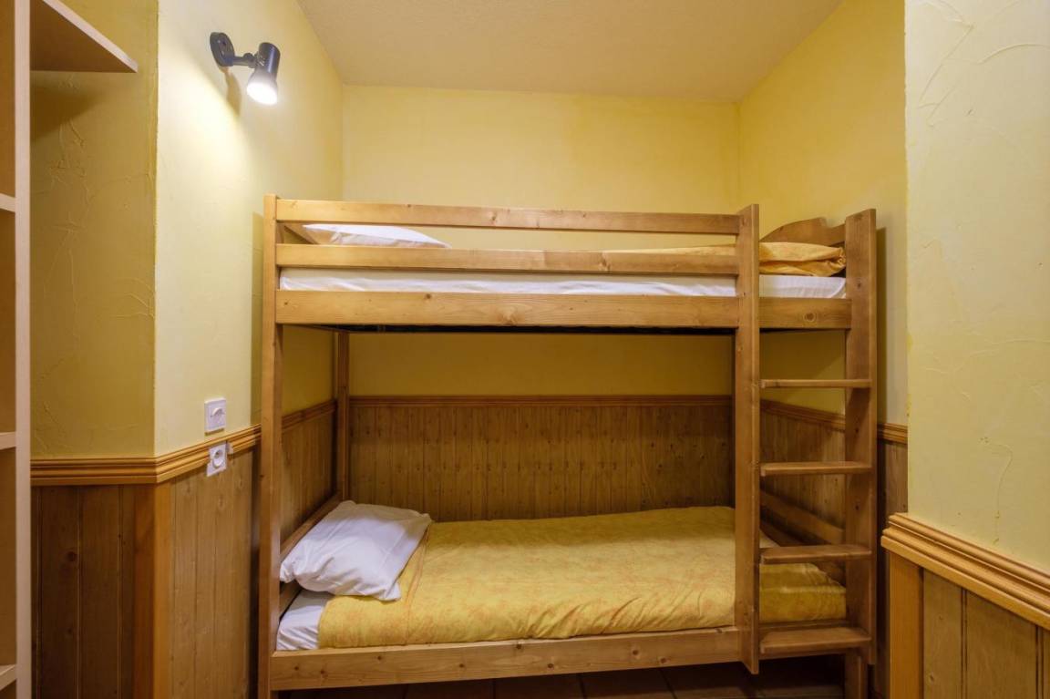 Fläche von ungefähr 36 m². Wohnzimmer mit Ausziehschlafcouch für 2 Personen. Schlafzimmer mit 2 zwei Einzelbetten. offener Schlafbereich mit 2 Stockbetten. Küche mit Wasserkocher, Kaffeemaschine (filtre), Toaster, Geschirrspülmaschine, Mikrowellenherd, 2 Glaskeramikkochfelder, Kühl-Gefrier-Kombination. Badezimmer mit Badewanne, Haartrockner. WC. Die oberen Betten sind nicht für Kinder unter 6 Jahren geeignet.