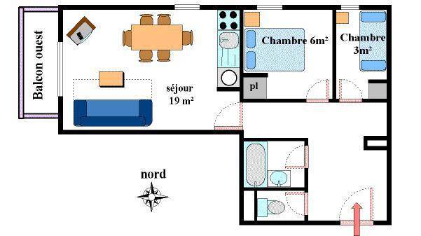 Fläche von ungefähr 42 m². 1te Etage. Orientierung : West. Blick berg (Dent Parrachée). Wohnzimmer mit Ausziehschlafcouch für 2 Personen. Schlafzimmer mit Doppelbett. Schlafzimmer mit Stockbetten. Kochnische mit Mikrowellengrill, Geschirrspülmaschine, 4 elektronische Herdplatten, Kühlschrank. Badezimmer mit Badewanne, Waschbecken, Haartrockner, WC. Balkon. Die oberen Betten sind nicht für Kinder unter 6 Jahren geeignet.