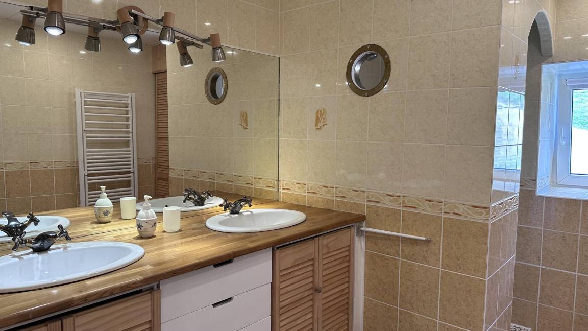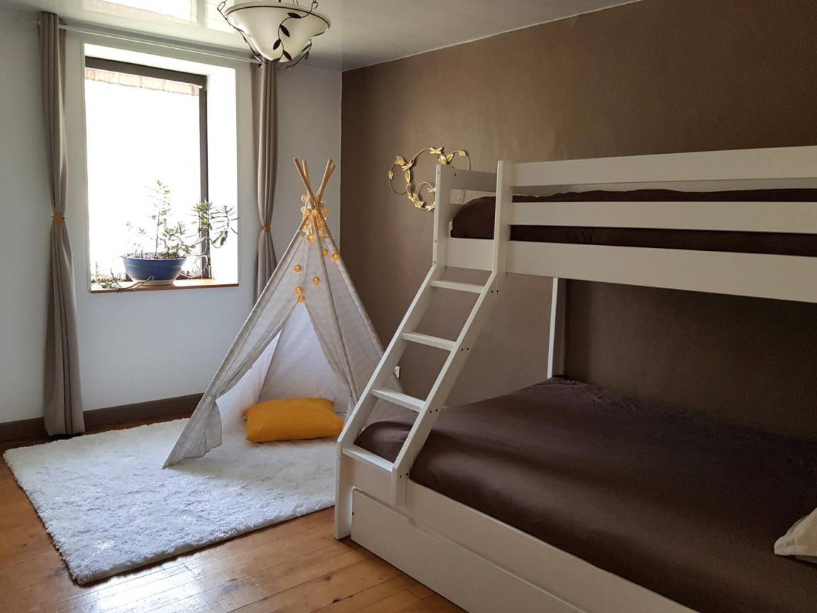 Etage: 3 Schlafzimmer mit bunten Farbtönen. Das Kinderzimmer verfügt über 1 Bett 140x190cm, davon ein Ausziehbett (90x190cm) und ein Etagenbett (90x190cm). Das blaue Schlafzimmer mit dem 160 x 200 cm großen Bett bietet Blick auf den Garten. Das dritte Schlafzimmer bietet ebenfalls ein 160x200cm großes Bett. Auf dieser Etage befindet sich das Badezimmer (Dusche) inklusive Toilette und eine zweite separate Toilette.