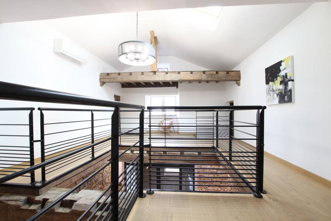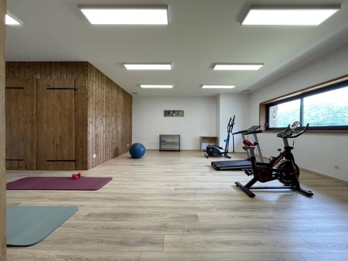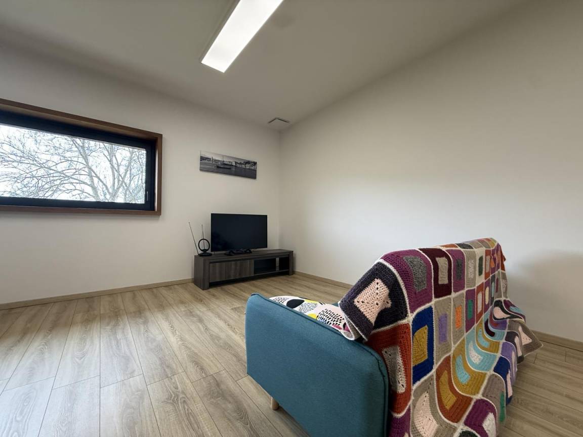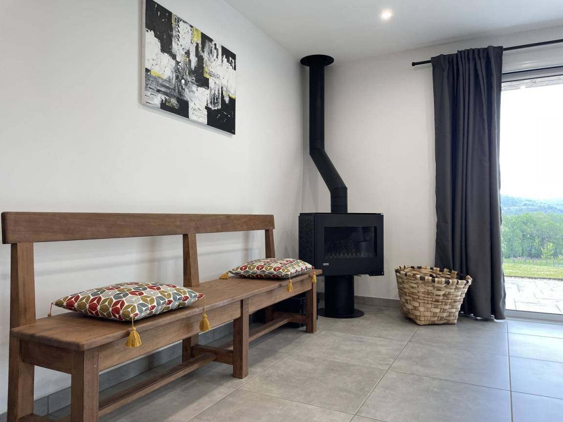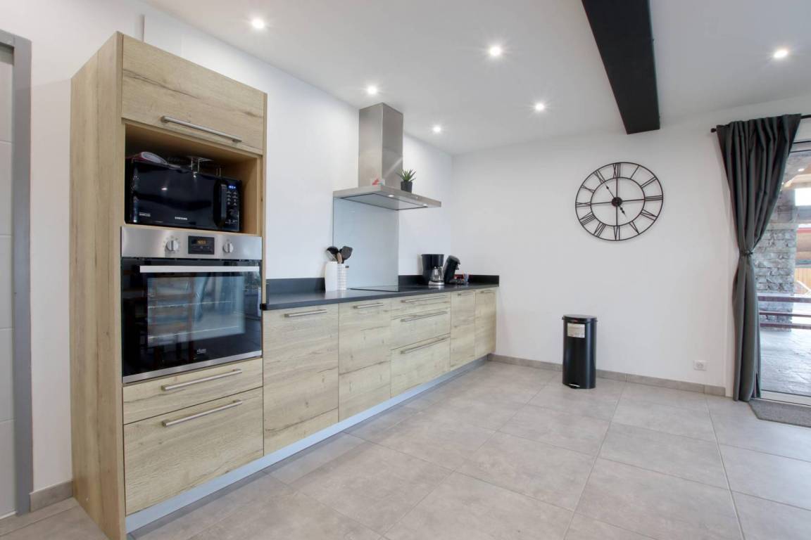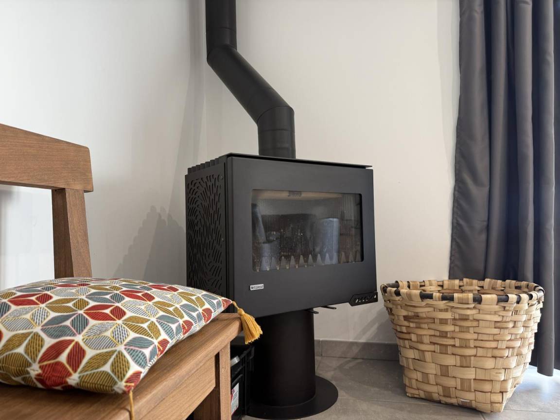- ein 75 m² großer Wohnbereich mit voll ausgestatteter Küche (Induktionskochfeld, Backofen, Geschirrspüler, Mikrowelle), Wohnzimmer und Aufenthaltsraum (Holzofen, Fernseher)