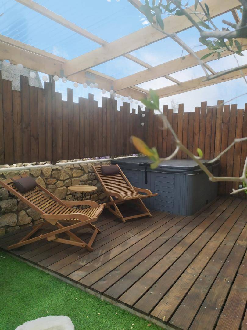 Zwei Terrassen. Die erste Terrasse ist mit Esstisch, Grill und Sonnenschirm ausgestattet. Die zweite Terrasse ist überdacht und verfügt über einen privaten Whirlpool für 5 Personen, der ganzjährig geöffnet ist, sowie Sonnenliegen.