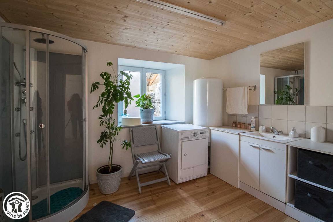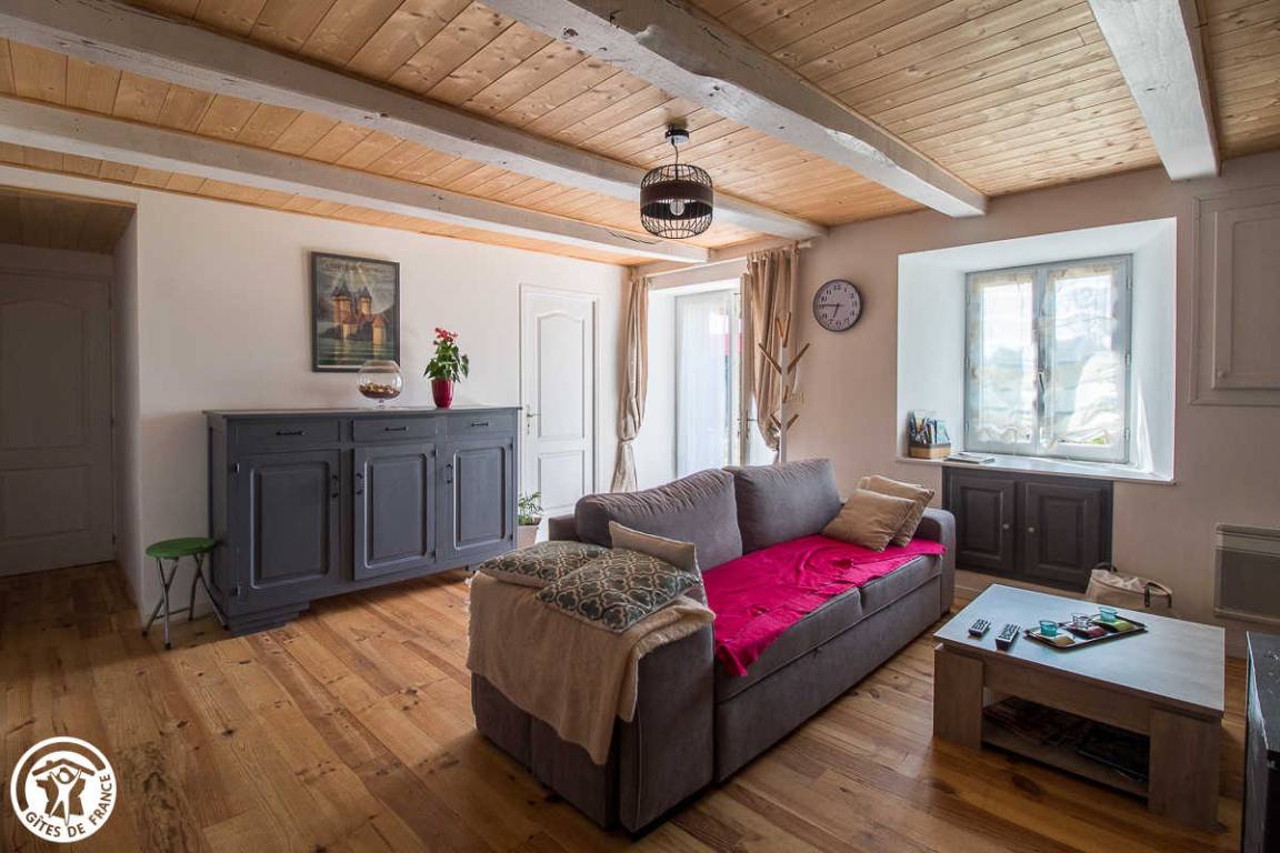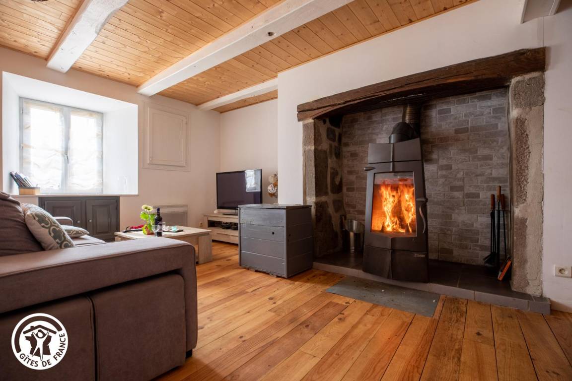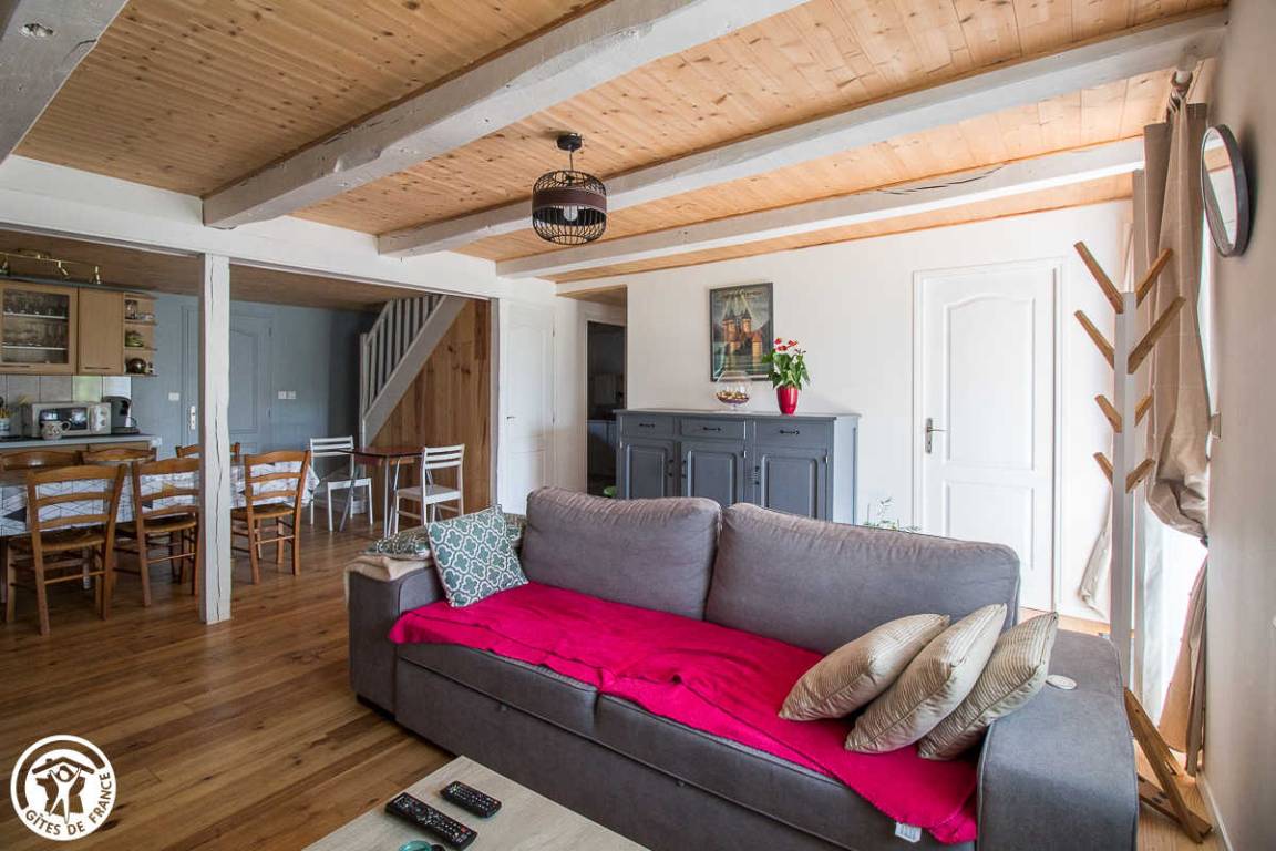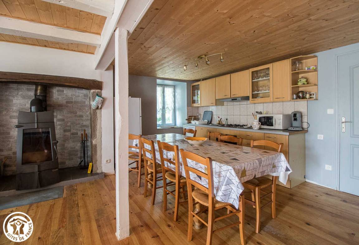 „Le gîte est spacieux et bien aménagé. Il doit être bien isolé car le poële à bois a suffit, au moins en bas où nous n'avons pas allumé les radiateurs électriques malgré le froid. Nous étions huit avec les enfants et petits-enfants et on ne s'est pas gêné. Côté cuisine, il y a tout l'équipement nécessaire. Le jardin fermé permet aux enfants de jouer dehors.“