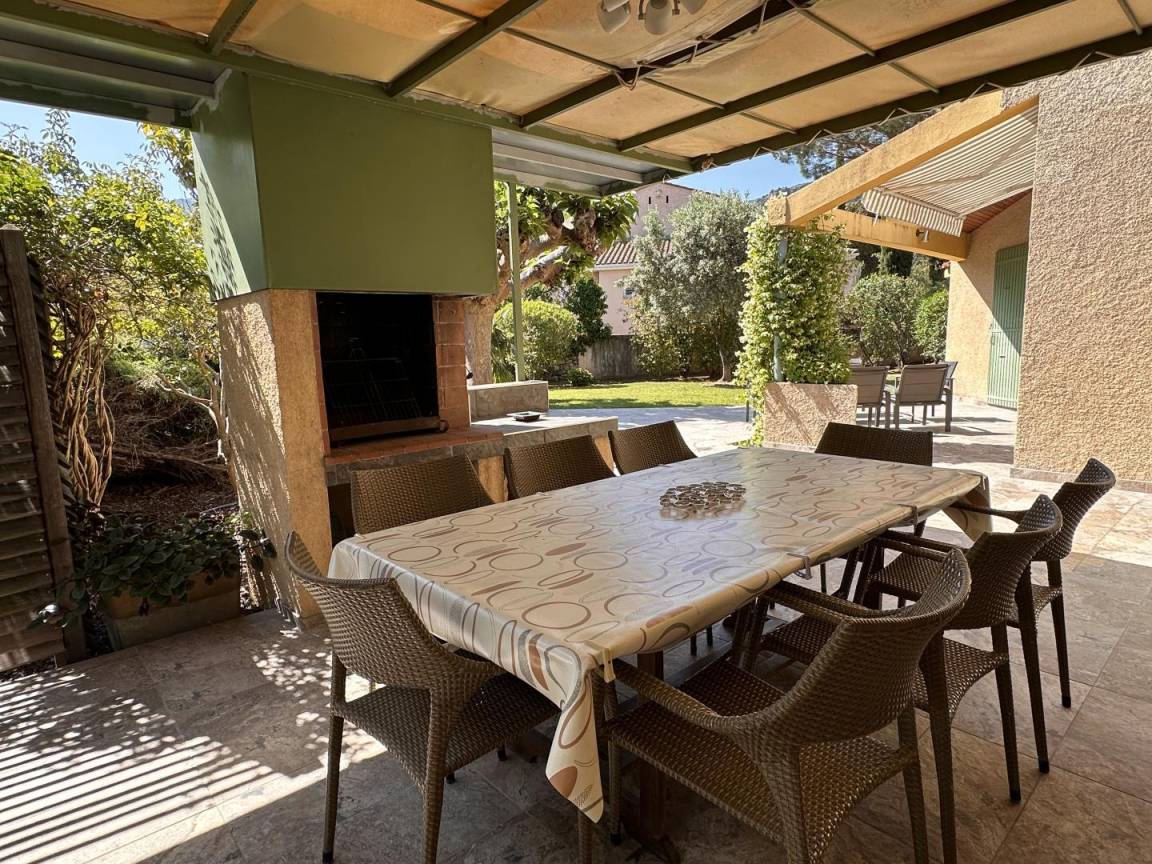 - Wohnzimmer und Küche mit Zugang zu einer schattigen Terrasse mit Grill,