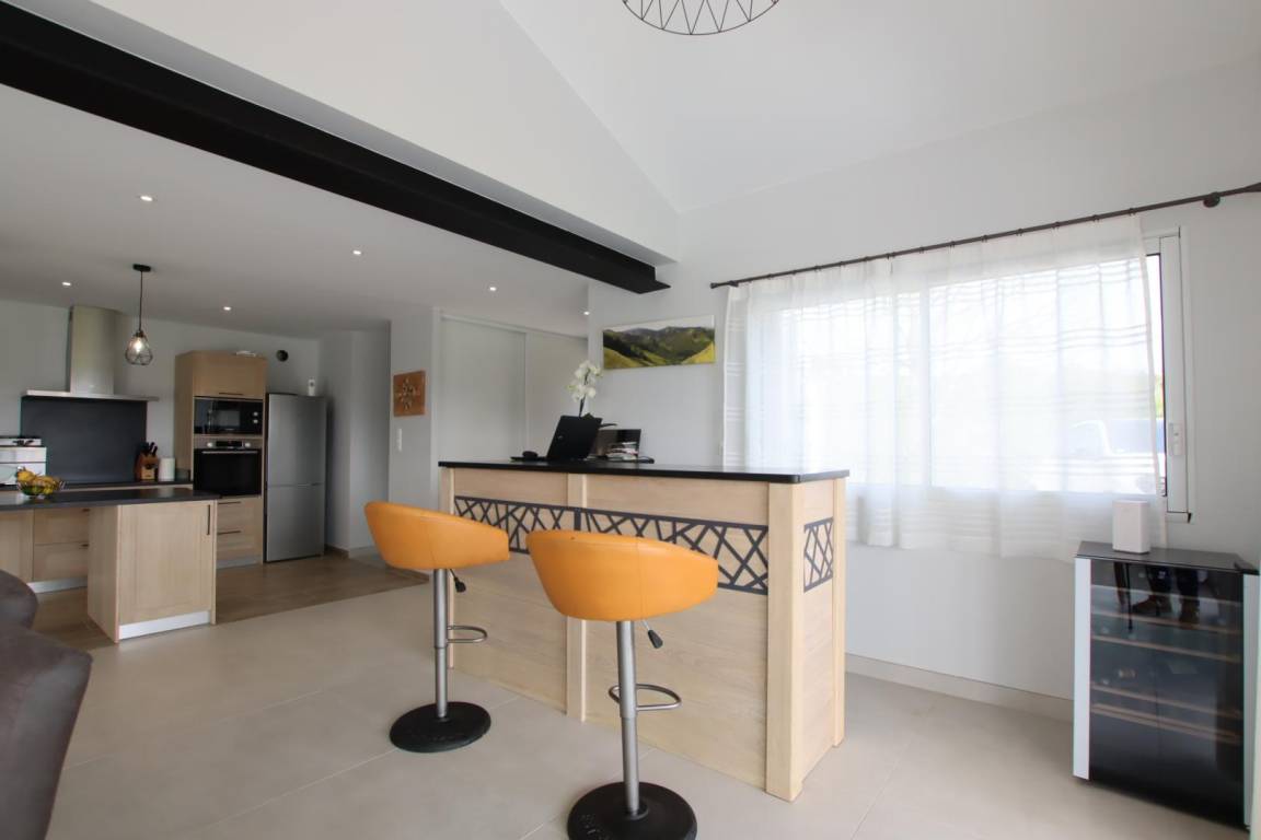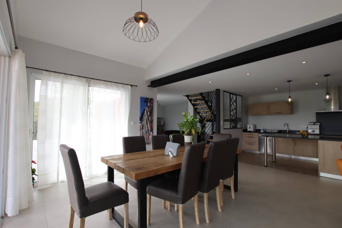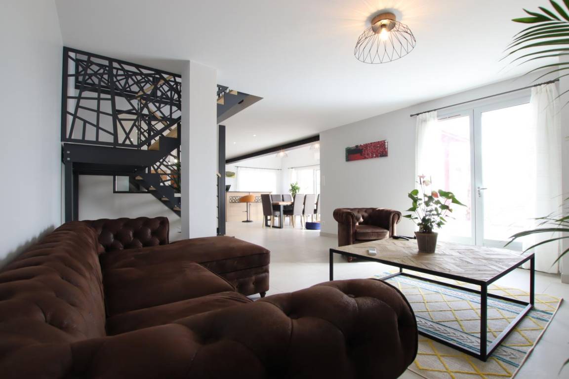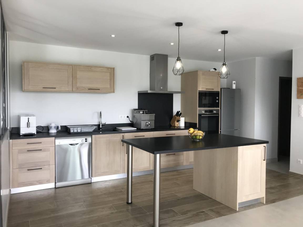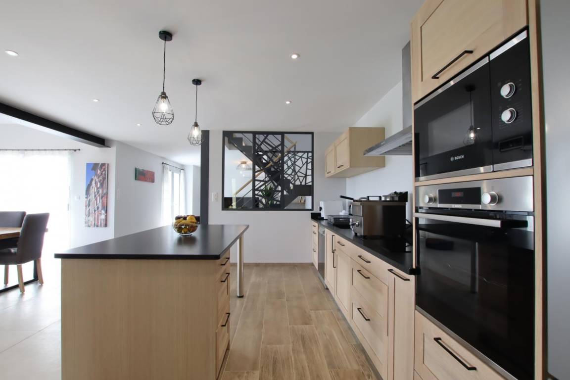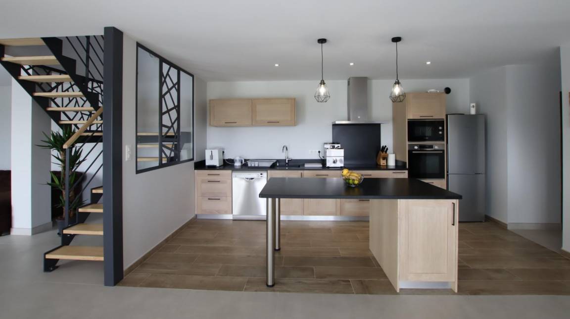 Im Erdgeschoss: großes, lichtdurchflutetes Wohnzimmer von 70 m² in einer Postkartenkulisse (sehr gut ausgestattete Küche - Induktionskochfeld, Backofen und Mikrowelle, Geschirrspüler, Kühlschrank mit Gefrierfach, Weinkeller), Essbereich mit Zugang zur Terrasse.