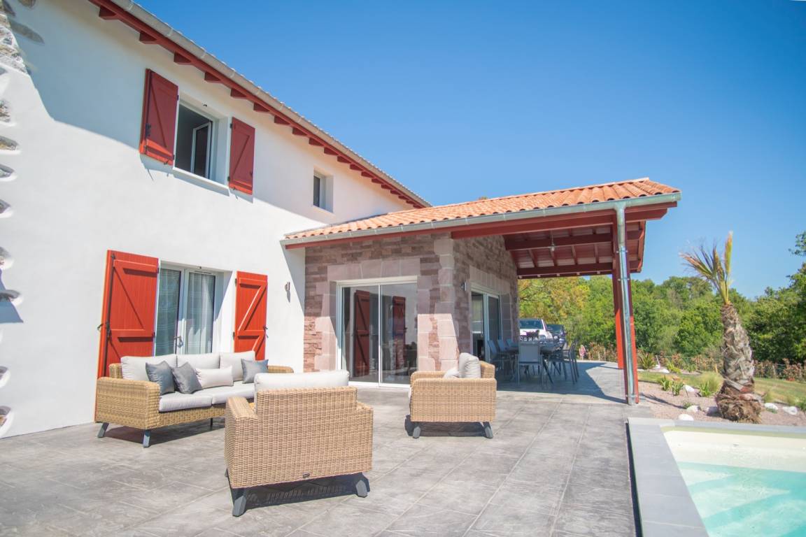 Die überdachte Terrasse bietet ein herrliches Panorama auf die Berge des Baskenlandes.