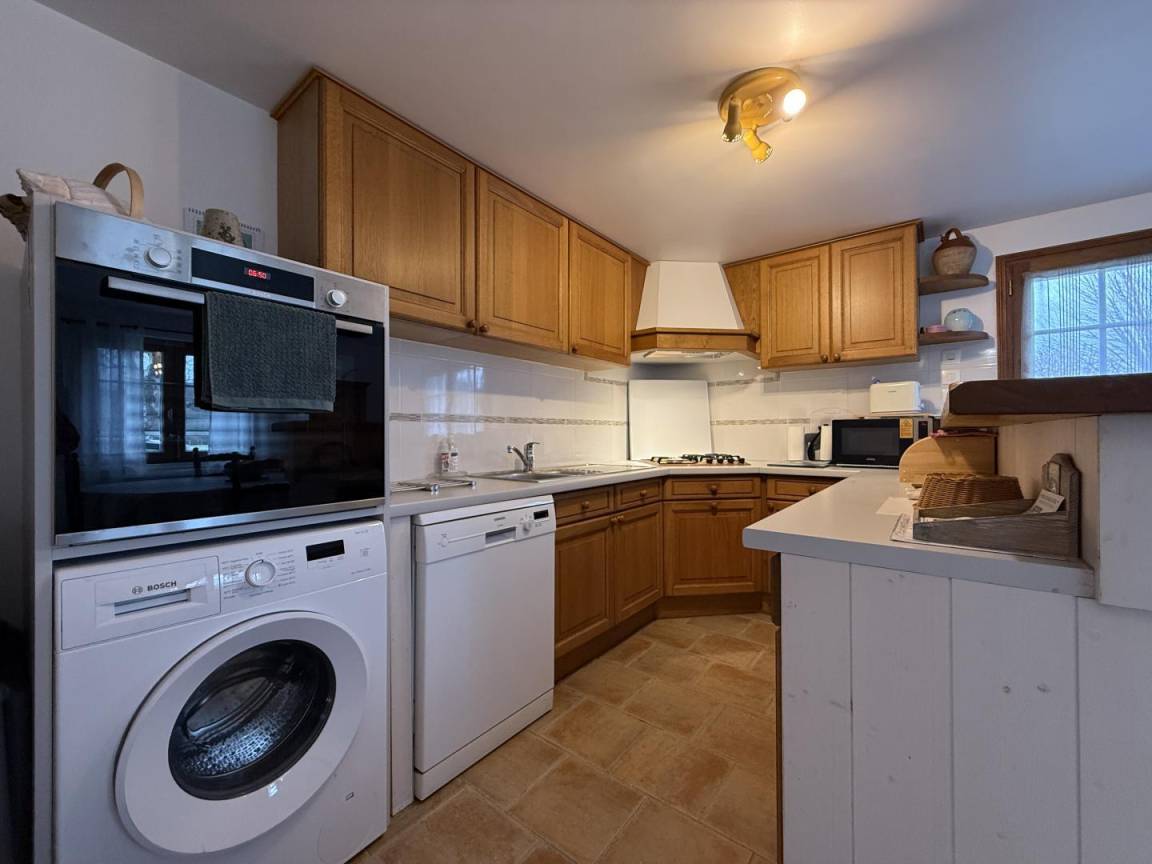 - einem Wohnzimmer mit voll ausgestatteter Küche (3-Flammen-Gasherd und 1 Elektroherd, Kühl-/Gefrierkombination, Geschirrspüler, Backofen, Mikrowelle, Waschmaschine), einem Wohnbereich und einer Sitzecke