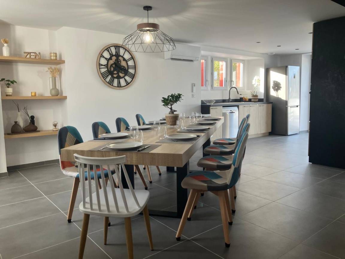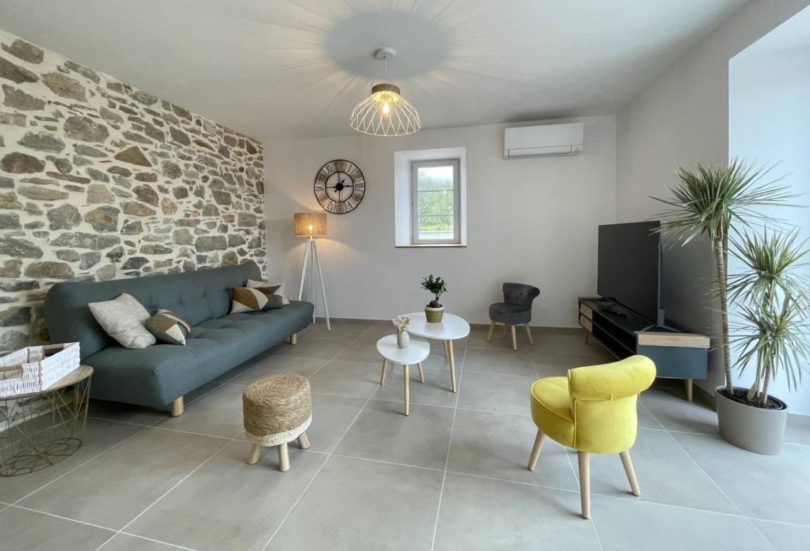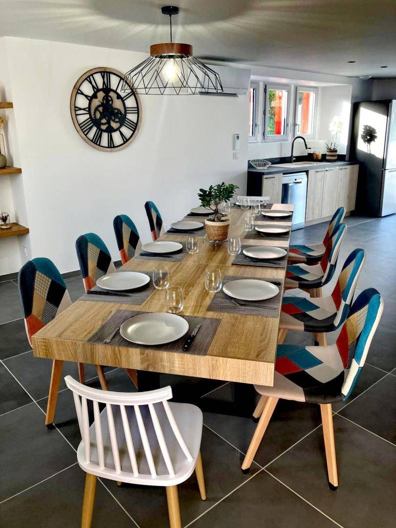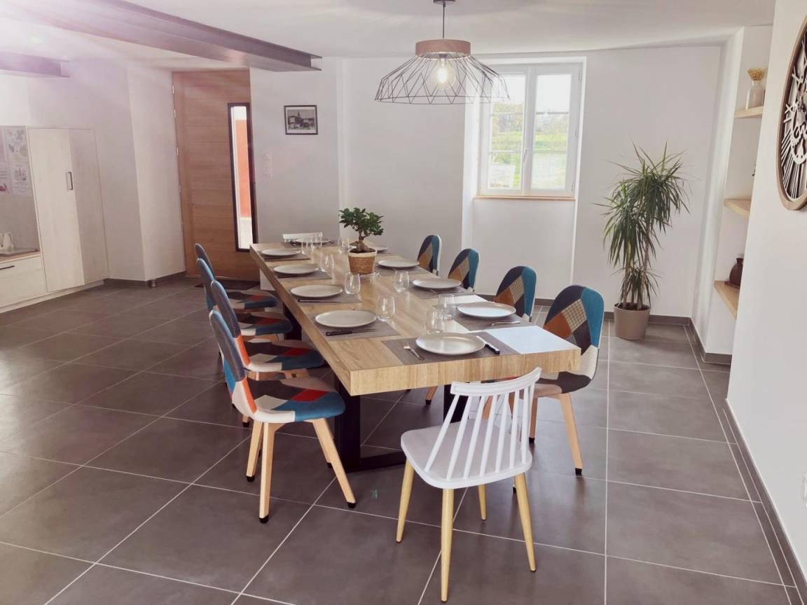 Das Wohnzimmer der 6-Sitzer-Gîte bietet Platz für eine Gruppe von 10 Personen und bringt sie an ihrem Tisch zusammen.