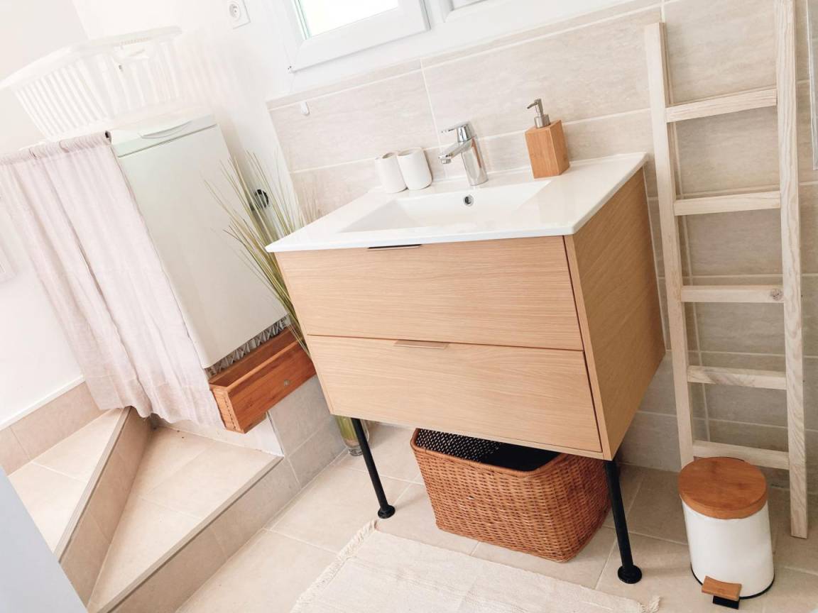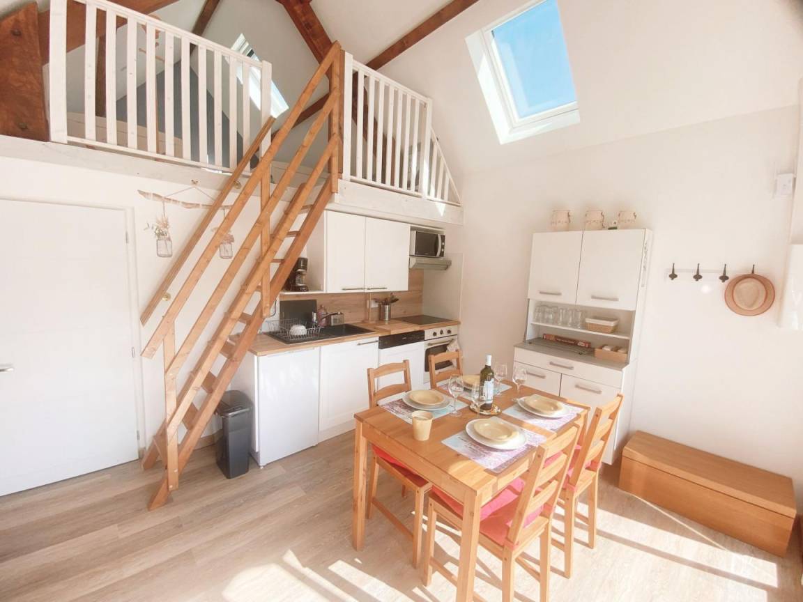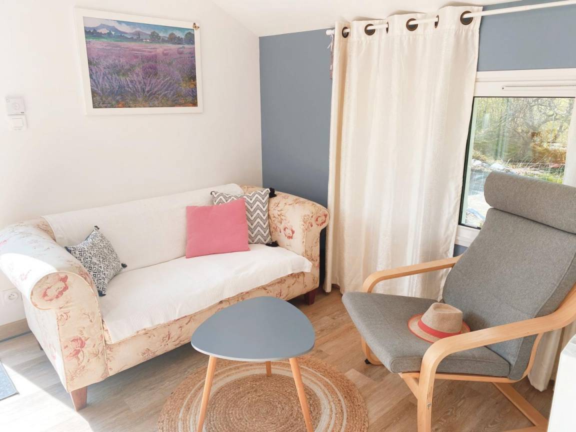 Das Cottage verfügt über ein Hauptschlafzimmer (Bett 160) mit direktem Zugang zum Garten und ein Zwischengeschoss im Dachgeschoss (2 Betten 90, die zusammengestellt werden können), eine ausgestattete Küche (Geschirrspüler, Backofen, Mikrowelle, Kühlschrank -Top, Induktionskochfeld), ein Badezimmer (italienische Dusche, Waschmaschine, WC), ein Wohnzimmer (TV, WLAN-Verbindung). Das Wohnzimmer öffnet sich auf die durch eine Markise geschützte Terrasse.