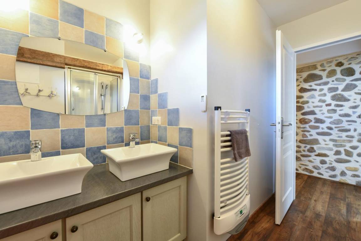 Obergeschoss: 2 Schlafzimmer (1 160 cm Bett, 2 90 cm Betten, die zusammengestellt werden können). Duschraum (Dusche, 2 Waschbecken). WC.