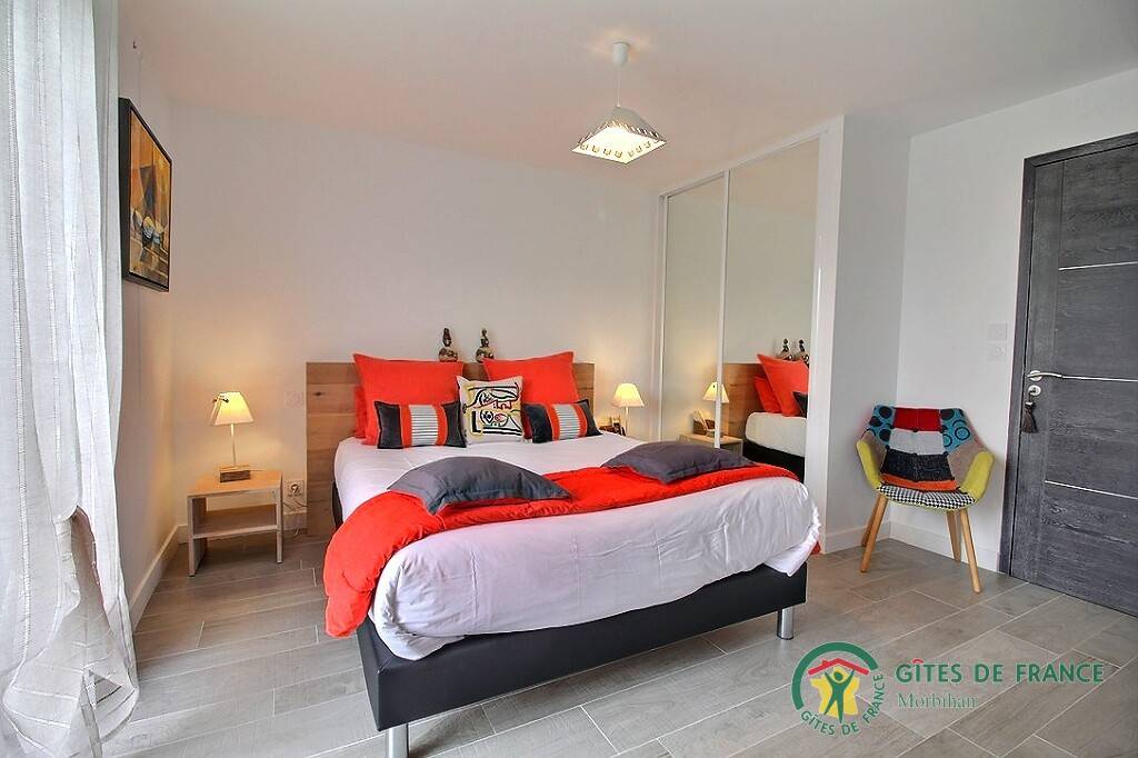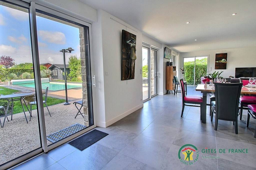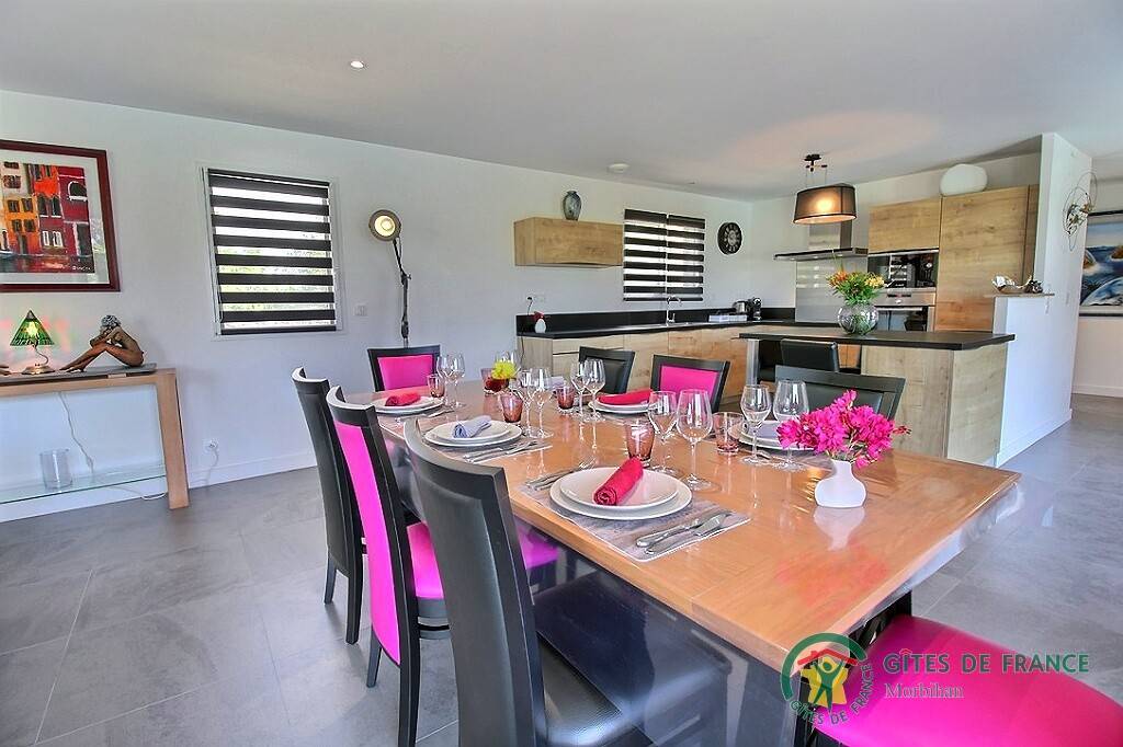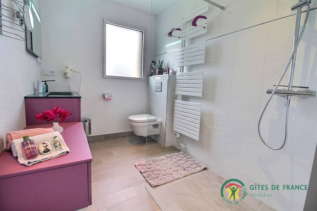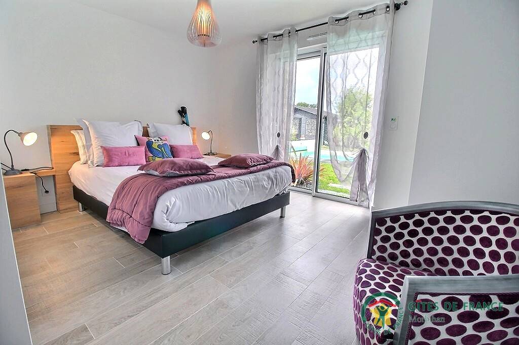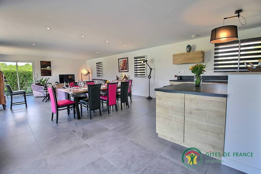 An exceptional property ! Have a memorable holiday in this light, comfortable, modern, spacious gite. Lounge-diner and open-plan kitchen. WC. Hot tub (for 2 people). Bedroom 1 : king-size bed, en-suite shower room with WC. Bedroom 2 : king-size bed, en-suite shower room with WC. Bedroom 3 : king-size bed, en-suite shower room with WC. Relax in the garden, on the sunny patio or in the swimming pool (counter current). The Gulf of Morbihan is just 5 minutes away, discover its coves, harbours and islands by boat or walk along the coastal footpath to admire the breathtaking scenery. The property is within easy reach of all the attractions of south Morbihan. All-inclusive price : utility charges and all linen. Indoor hot tub for 2 people. Outdoor swimming pool with security cover and solar shower, heated May-September. Boules alley. Laundry facilities. Prices from 800€ for 2 people for a week in April, May, June, September, please contact the owners.