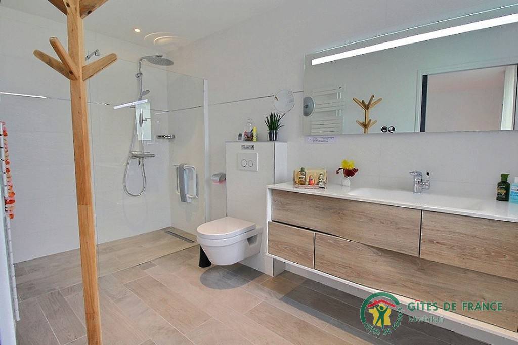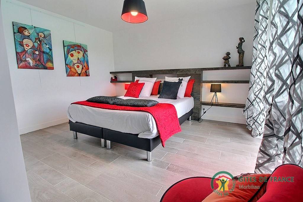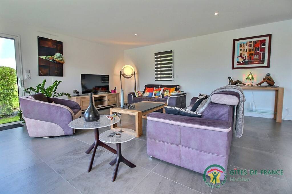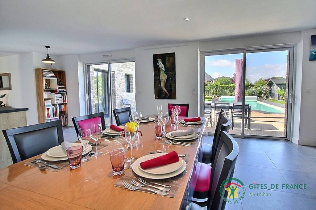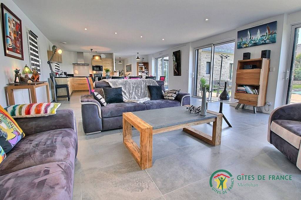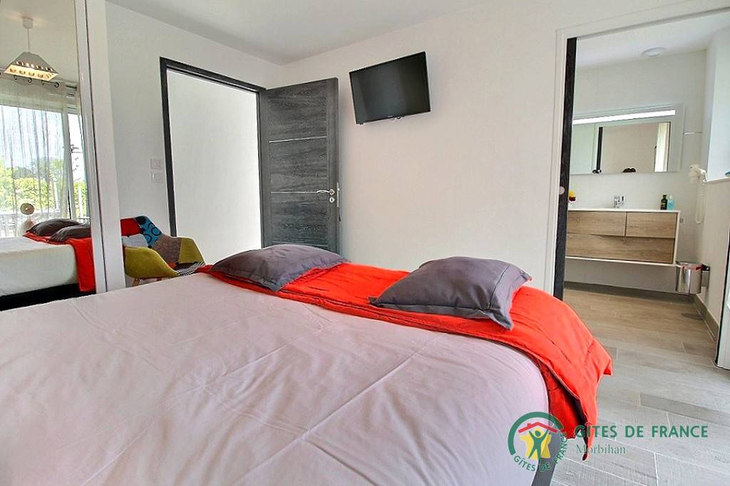 An exceptional property ! Have a memorable holiday in this light, comfortable, modern, spacious gite. Lounge-diner and open-plan kitchen. WC. Hot tub (for 2 people). Bedroom 1 : king-size bed, en-suite shower room with WC. Bedroom 2 : king-size bed, en-suite shower room with WC. Bedroom 3 : king-size bed, en-suite shower room with WC. Relax in the garden, on the sunny patio or in the swimming pool (counter current). The Gulf of Morbihan is just 5 minutes away, discover its coves, harbours and islands by boat or walk along the coastal footpath to admire the breathtaking scenery. The property is within easy reach of all the attractions of south Morbihan. All-inclusive price : utility charges and all linen. Indoor hot tub for 2 people. Outdoor swimming pool with security cover and solar shower, heated May-September. Boules alley. Laundry facilities. Prices from 800€ for 2 people for a week in April, May, June, September, please contact the owners.