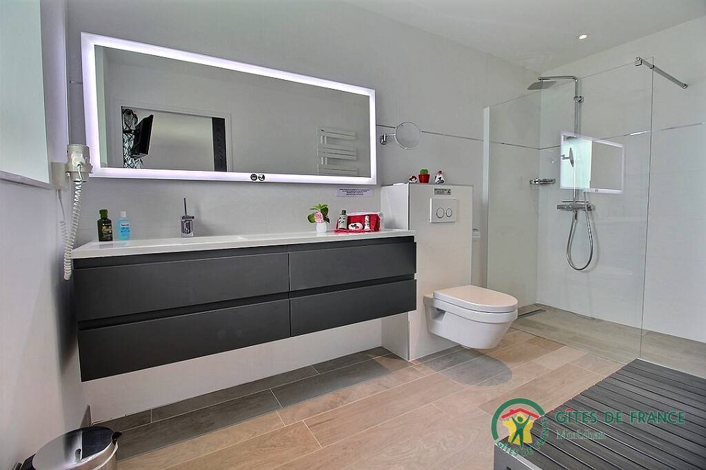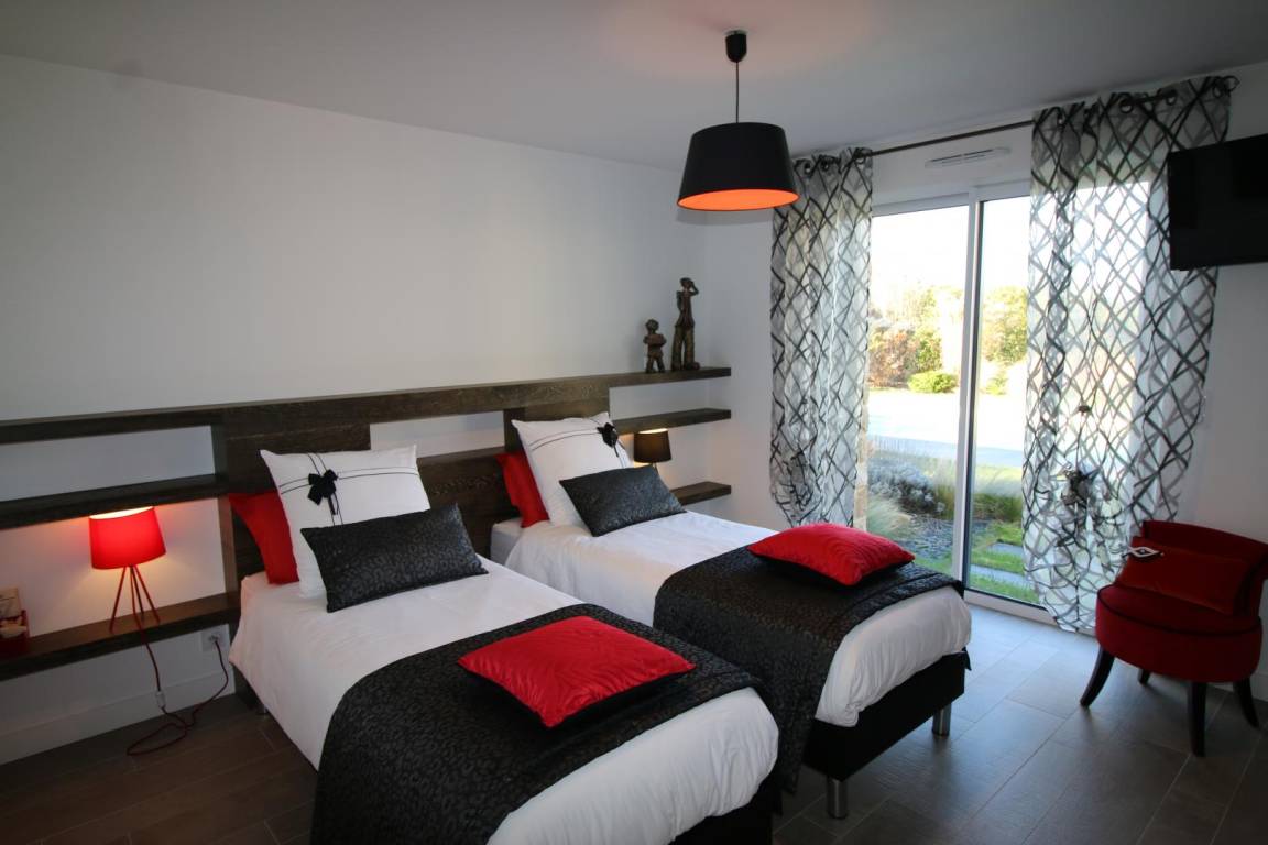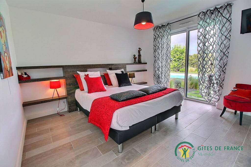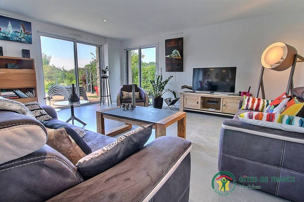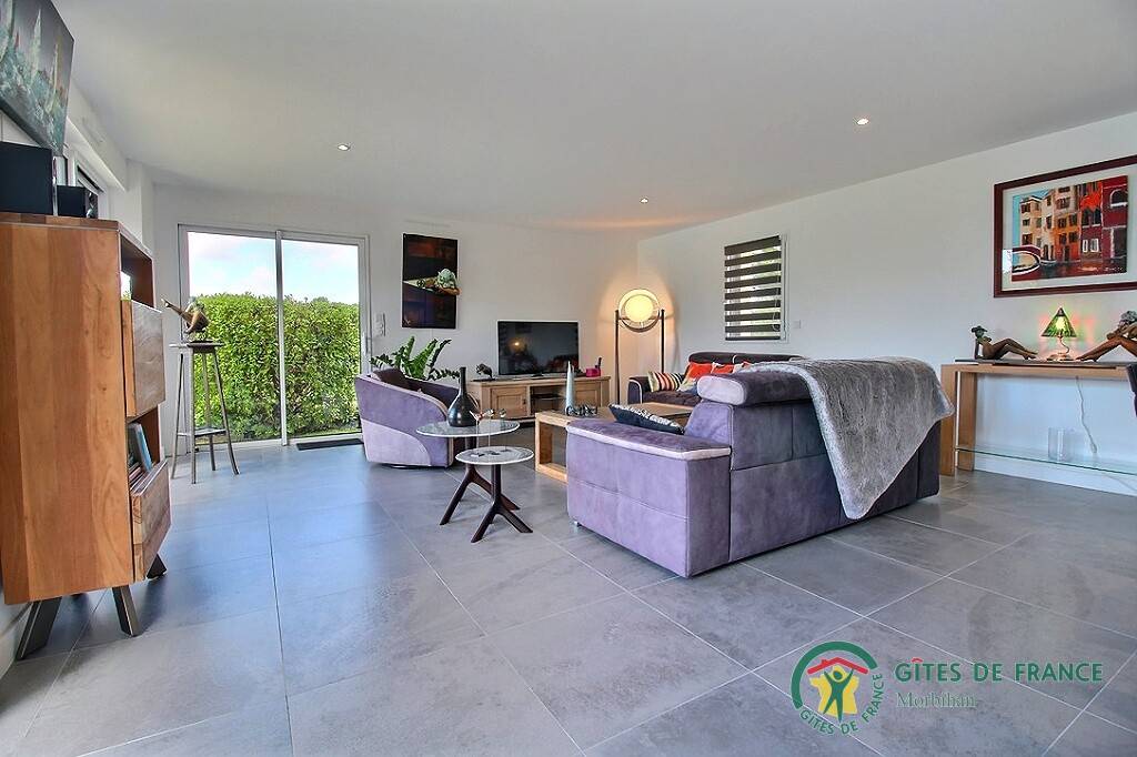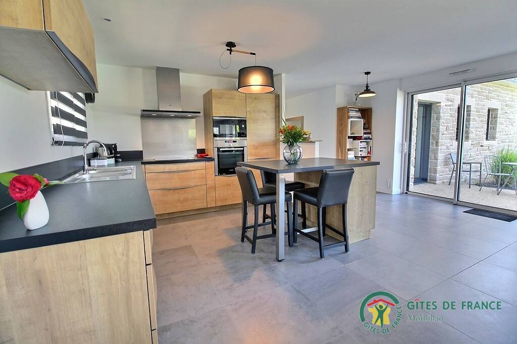 An exceptional property ! Have a memorable holiday in this light, comfortable, modern, spacious gite. Lounge-diner and open-plan kitchen. WC. Hot tub (for 2 people). Bedroom 1 : king-size bed, en-suite shower room with WC. Bedroom 2 : king-size bed, en-suite shower room with WC. Bedroom 3 : king-size bed, en-suite shower room with WC. Relax in the garden, on the sunny patio or in the swimming pool (counter current). The Gulf of Morbihan is just 5 minutes away, discover its coves, harbours and islands by boat or walk along the coastal footpath to admire the breathtaking scenery. The property is within easy reach of all the attractions of south Morbihan. All-inclusive price : utility charges and all linen. Indoor hot tub for 2 people. Outdoor swimming pool with security cover and solar shower, heated May-September. Boules alley. Laundry facilities. Prices from 800€ for 2 people for a week in April, May, June, September, please contact the owners.