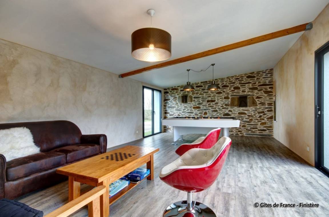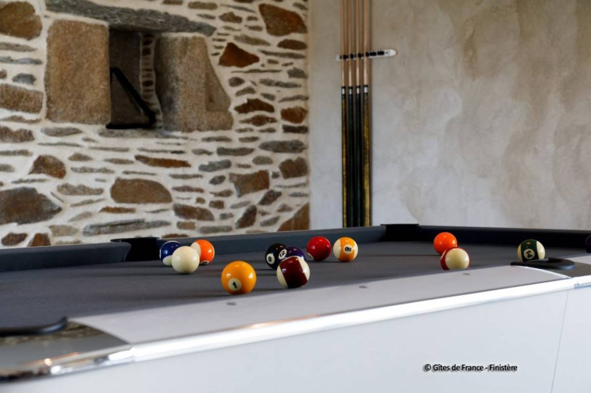 „merci pour un séjour inoubliable dans ce gîte authentique, spacieux, très bien équipé et parfaitement situé entre le phare Saint-Mathieu et le musée mémoires 39-45. Toute la famille pouvait profiter du billard, du ping-pong, du baby-foot et bien sûr du jacuzzi.“