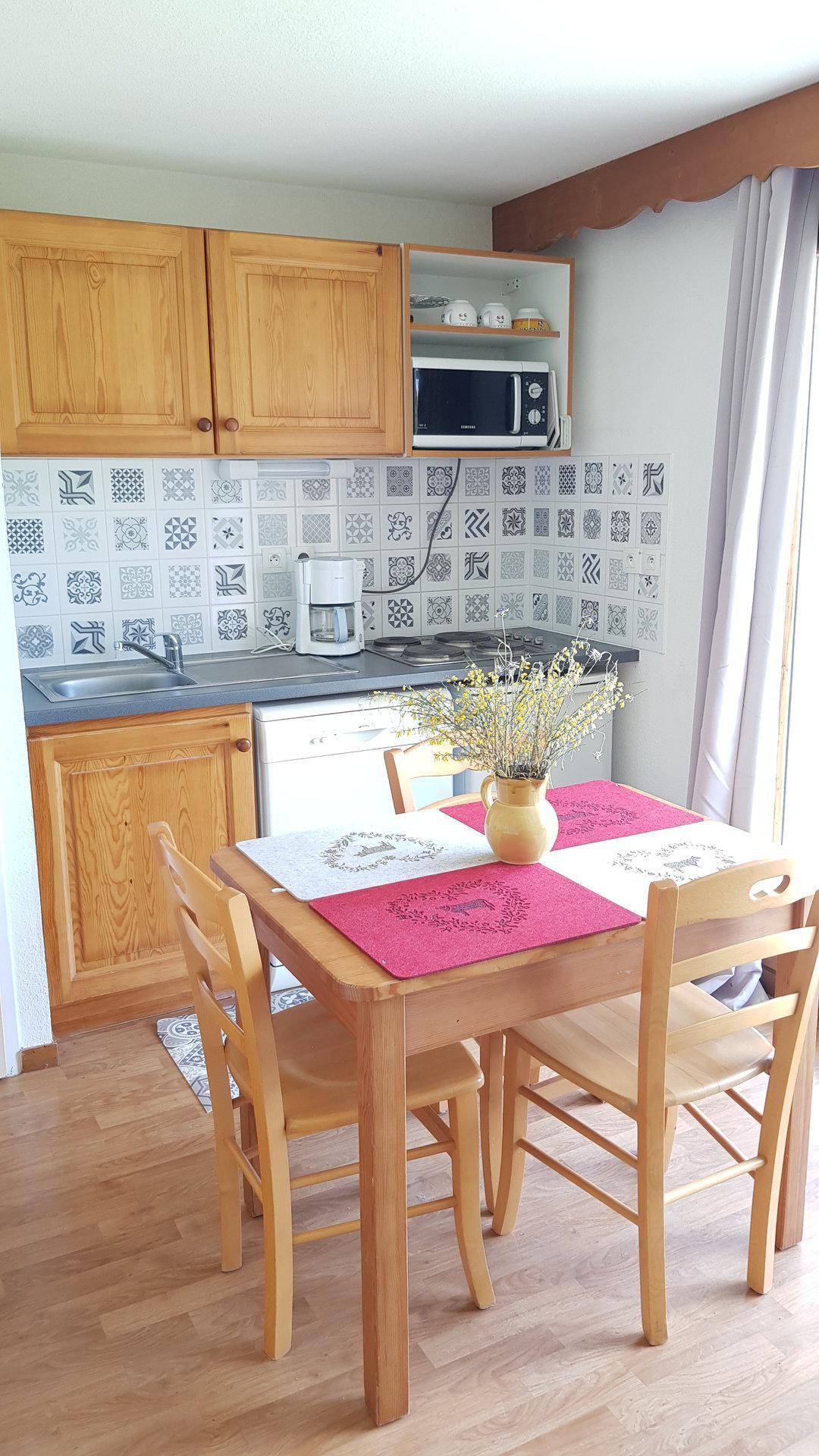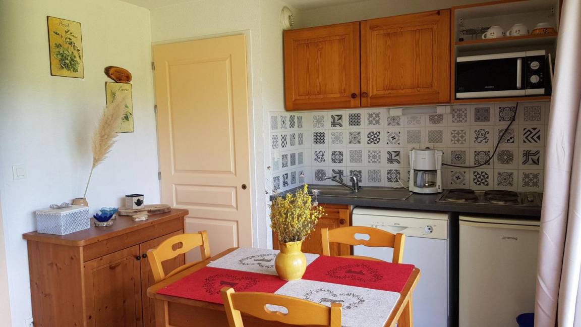 Fläche von ungefähr 25 m². Erdgeschoss. Orientierung : Süd, West. Blick berg. Wohnzimmer mit Klappschlafcouch. offener Schlafbereich mit 2 Stockbetten. Kochnische mit Wasserkocher, Kaffeemaschine (senseo + filtre), Geschirrspülmaschine, Mikrowellenherd, elektronische Herdplatten, Kühlschrank. Badezimmer mit Badewanne. separates WC. Terrasse. Die oberen Betten sind nicht für Kinder unter 6 Jahren geeignet.