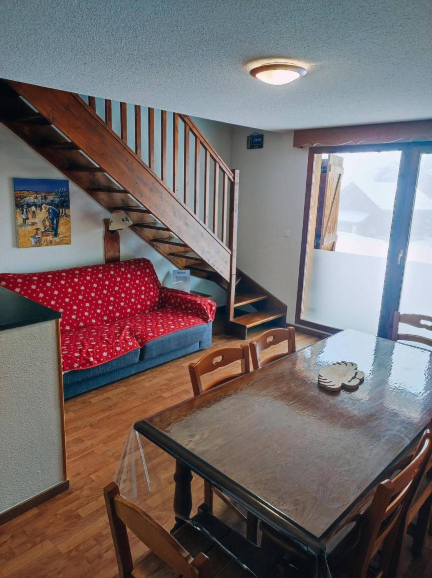 Fläche von ungefähr 55 m². Blick berg. Niveau 0 : Wohnzimmer mit Klappschlafcouch. offener Schlafbereich mit 2 Stockbetten. Kochnische mit Fonduegerät, Raclettegerät, Wasserkocher, Kaffeemaschine (filtres & Senseo), Toaster, Geschirrspülmaschine, Mikrowellenherd, 2 Glaskeramikkochfelder, Kühlschrank. Waschräume mit Dusche. separates WC. Terrasse. Niveau 1 : 2 Schlafzimmer mit 2 Einzelbetten. Badezimmer mit Badewanne, WC. Die oberen Betten sind nicht für Kinder unter 6 Jahren geeignet.