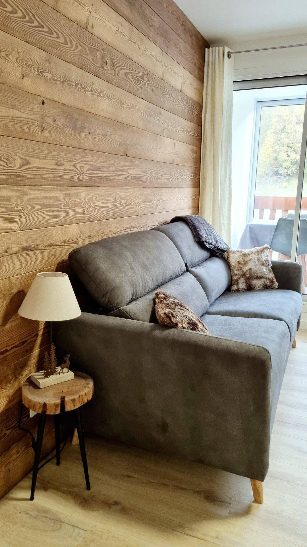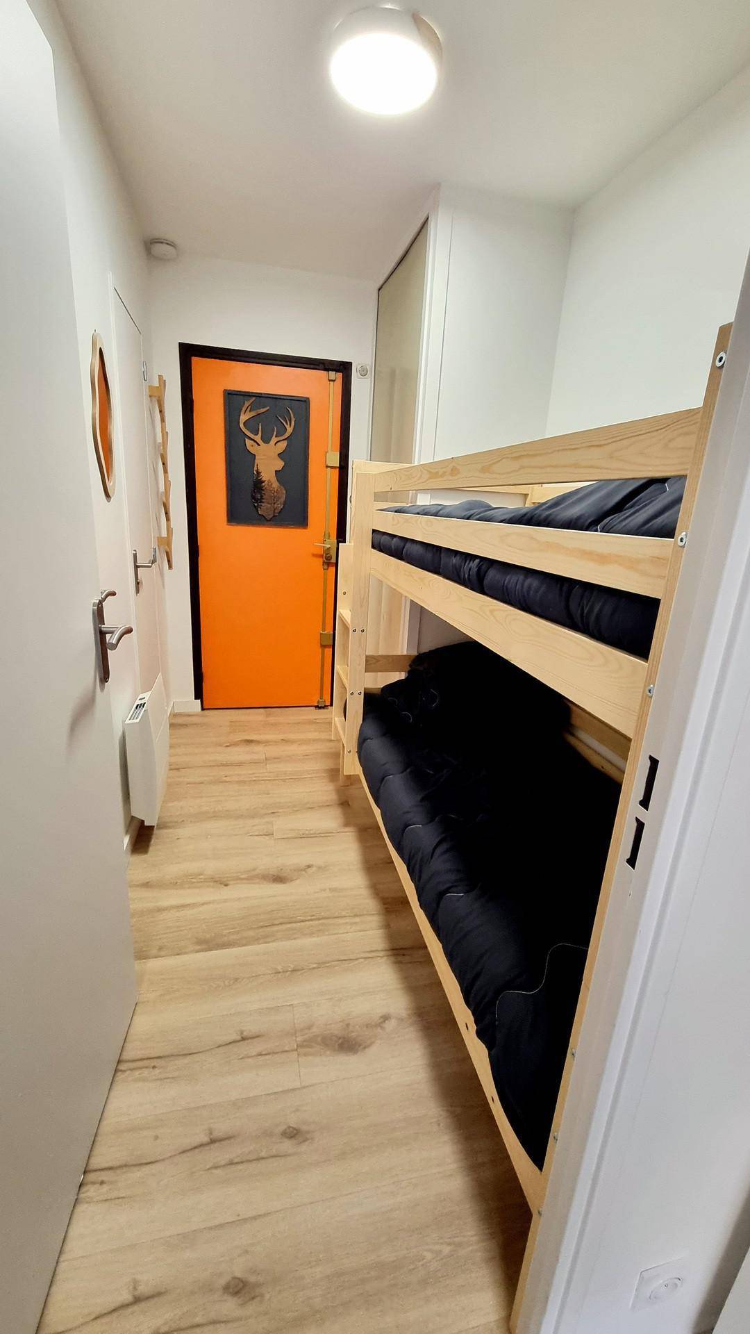Fläche von ungefähr 27 m². 2te Etage. Orientierung : Süd. Wohnzimmer mit Klappschlafcouch (160x200). offener Schlafbereich mit 2 Stockbetten. Kochnische mit Raclettegerät, Wasserkocher, Kaffeemaschine, Backofen, kleiner Backofen mit Mikrowellenfunktion, Toaster, Geschirrspülmaschine, Mikrowellenherd, 2 elektronische Herdplatten, Kühlschrank. Badezimmer mit Dusche, WC. Veranda. Die oberen Betten sind nicht für Kinder unter 6 Jahren geeignet.