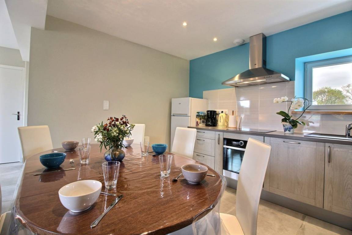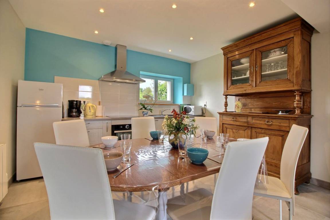 Dieses Ferienhaus, angrenzend an dem Wohnsitz der Eigentümer, umfasst : im Erdgeschoss : ein Ess-Wohnzimmer mit offener, komplett ausgestatteter Küche (Kaffeepad-Maschine), eine separate Toilette. Im Obergeschoss : 2 Schlafzimmer (2 x 1 Bett für 2 Personen 140x190), 1 Schlafzimmer (1 Bett für eine Person 130x190), ein Badezimmer, eine separate Toilette. Terrasse im Aufbau an der Frontseite des Hauses, Garten mit Rasenfläche in Entwicklung auf der Rückseite des Hauses. Hof mit Schuppen zur gemeinsamen Verfügung mit den Besitzern, dort kann das Fahrzeug geparkt werden.