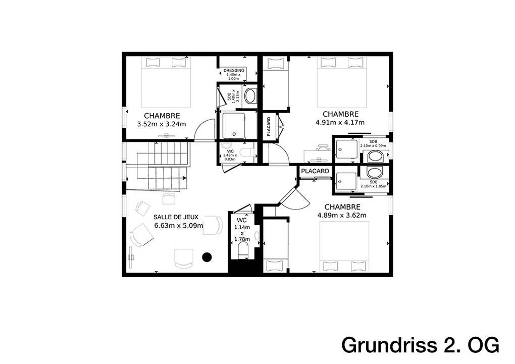 2. Etage mit Schrägen: Doppelzimmer mit Sat-TV, Bad (Dusche, Wb). 2 Dreibettzimmer, jeweils mit Sat-TV und Bad (Dusche, Wb). 2 separate WC. Offenes Spielzimmer mit Sitzgelegenheiten und Sat-TV.