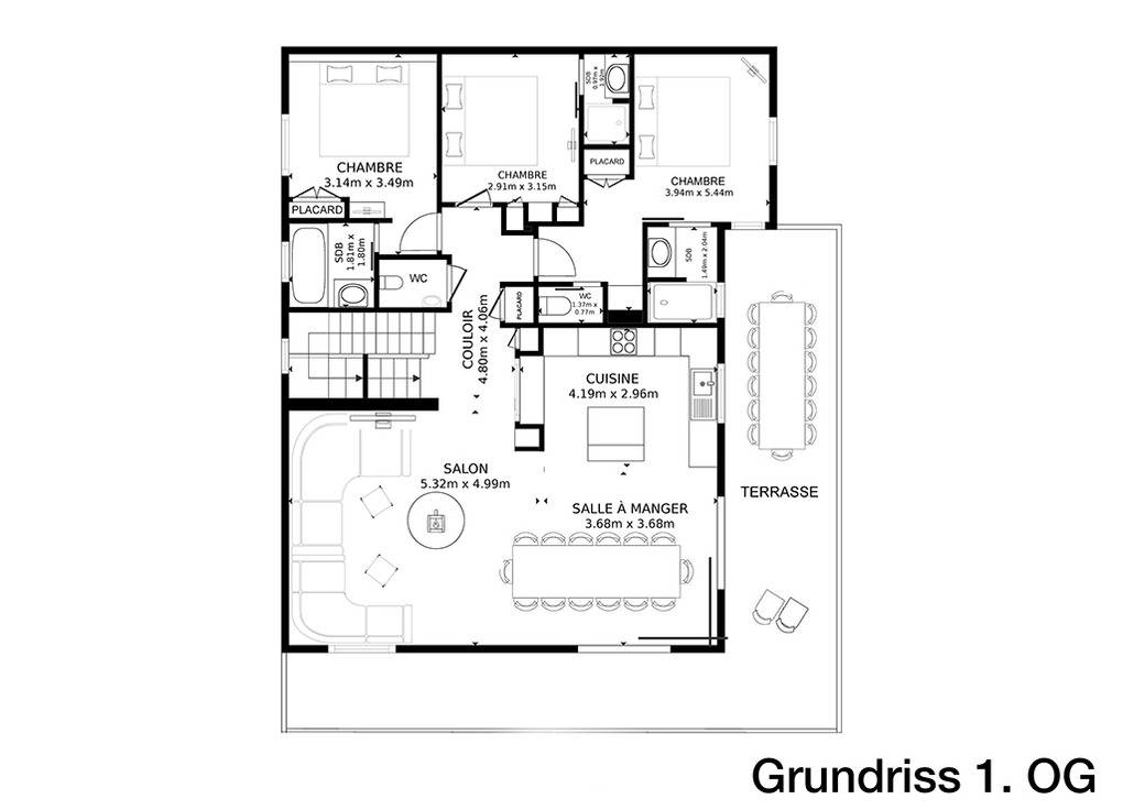 1. Etage: Großer Wohn-/Essraum mit gemütlichem Ecksofa, Kaminofen (Holz wird gestellt), Sat-TV, großem Esstisch, moderner, gut ausgestatteter Küchezeile (Backofen, Mikrowelle, Tiefkühlschrank 50 L, Geschirrspüler, Kaffeemaschine, Nespresso-Kaffeemaschine, Raclette-, Fonduegeräte). Doppelzimmer mit Sat-TV, Bad (Badewanne. Wb). 2 Doppelzimmer mit jeweils Sat-TV, Bad (Dusche, Wb). 2 Separate WC. Terrasse mit Sitzmöbeln, Liegen und herrlichem Blick ins Skigebiet.