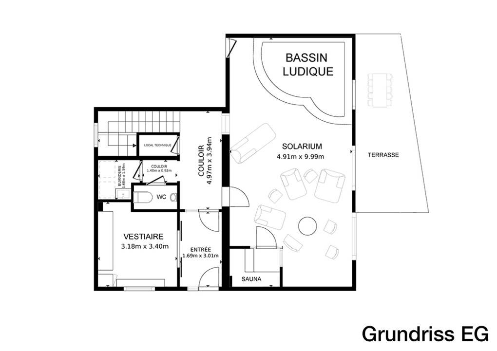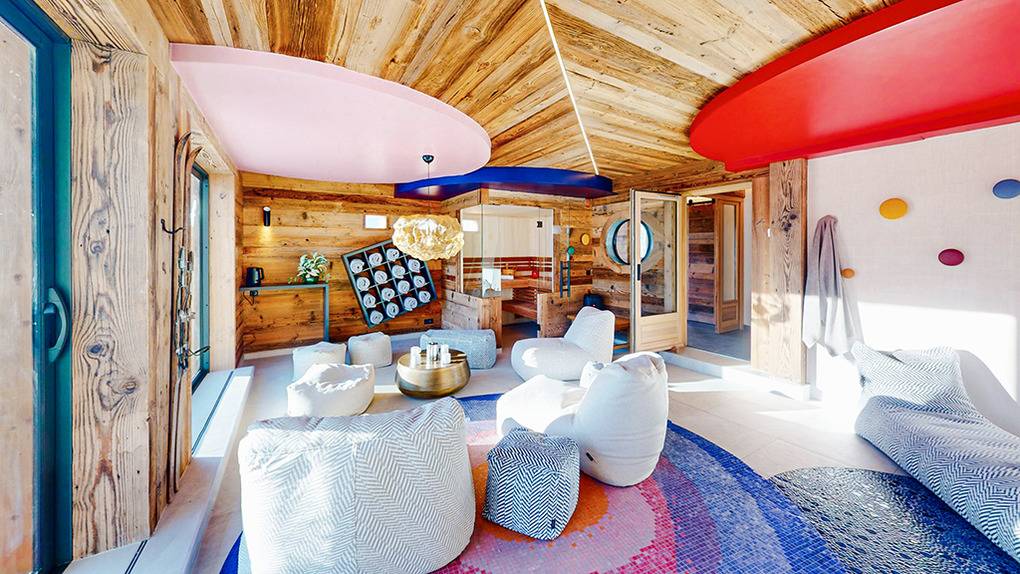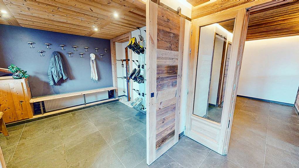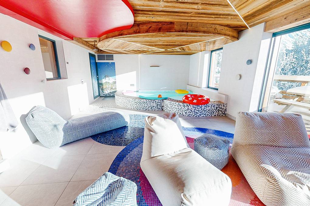 Erdgeschoss: Eingangsbereich mit großem Skischuhraum, Bänken, beheizten Schuhtrocknern, Skihaken. Waschraum mit Waschmaschine, Trockner. Separates WC. Ein 50 qm großer Spabereich mit Sauna, Dusche, einem 10 qm, 35 Grad warmen, großen Spielbad (0,25 bis 1 Meter tief) mit Massagedüsen, Plantschbecken mit Panoramablick. Direkter Zugang zur Terrasse mit Sitzmöblen, Liegen und herrlichem Blick ins Skigebiet.