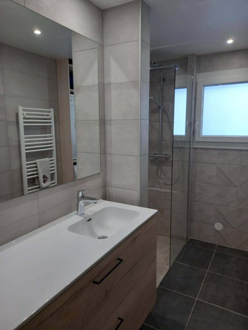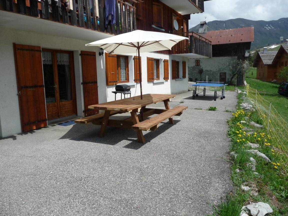Fläche von ungefähr 103 m². 2te Etage. Orientierung : Süd. Blick berg (chaîne des Aravis). Wohnzimmer mit Sofa, DVD-Spieler, TV. Schlafzimmer ab 13.85 m² mit Klimatisierung, Doppelbett. Schlafzimmer ab 10.10 m² mit Doppelbett (160). Schlafzimmer ab 10.10 m² mit 2 Einzelbetten. Zwischengeschoss mit 2 Einzelbetten. offener Schlafbereich ab 5.35 m² mit 2 Stockbetten. Küche mit Fonduegerät, Raclettegerät, Wasserkocher, Kaffeemaschine, Gefrierschrank, Backofen, Geschirrspülmaschine, Mikrowellenherd, 2 Glaskeramikkochfelder, Kühlschrank. Badezimmer mit Badewanne, Waschmaschine, Haartrockner, Wäschetrockner, Handtuchtrockner. Badezimmer mit Dusche. 2 separate WCs. Balkon mit Gartentisch und -stühle. Die oberen Betten sind nicht für Kinder unter 6 Jahren geeignet.