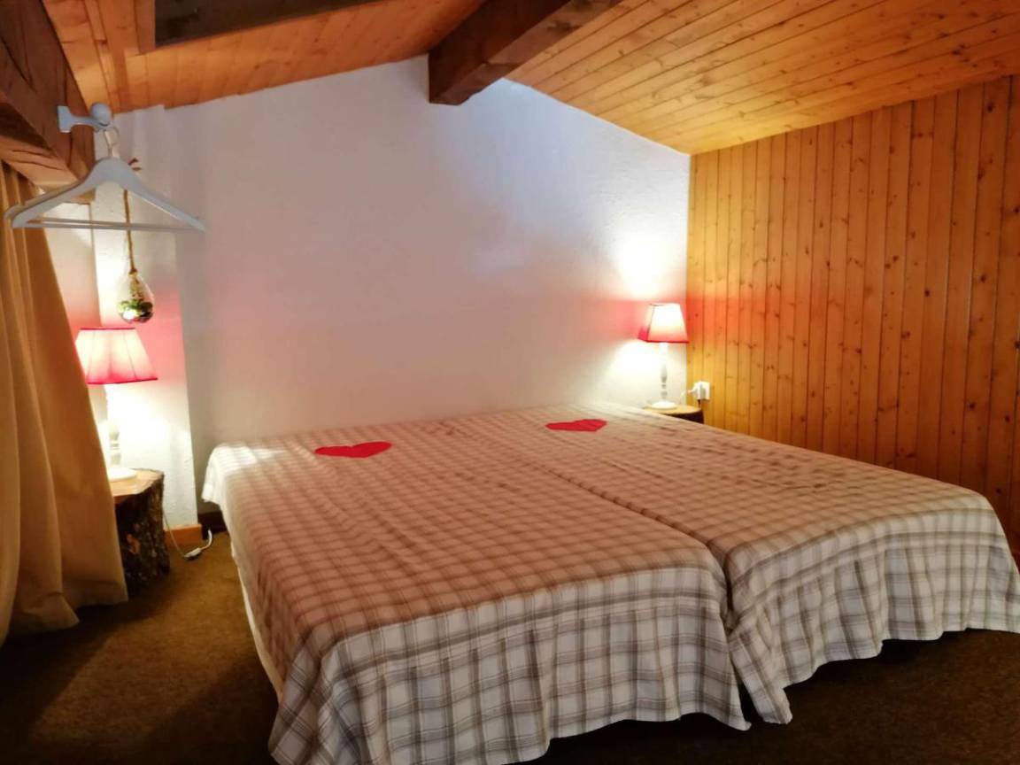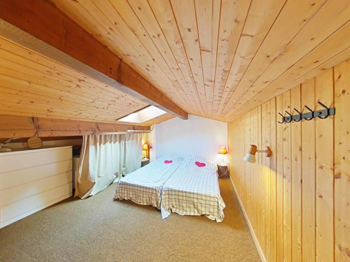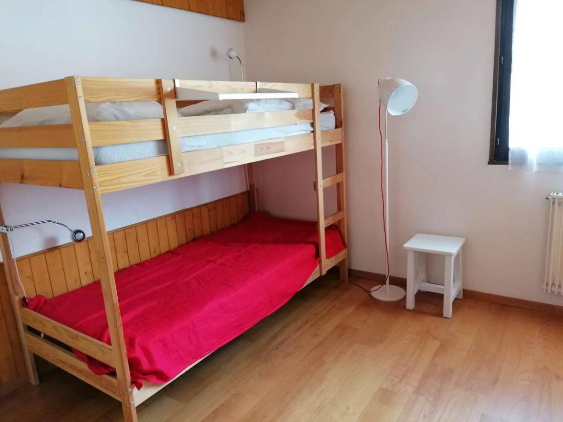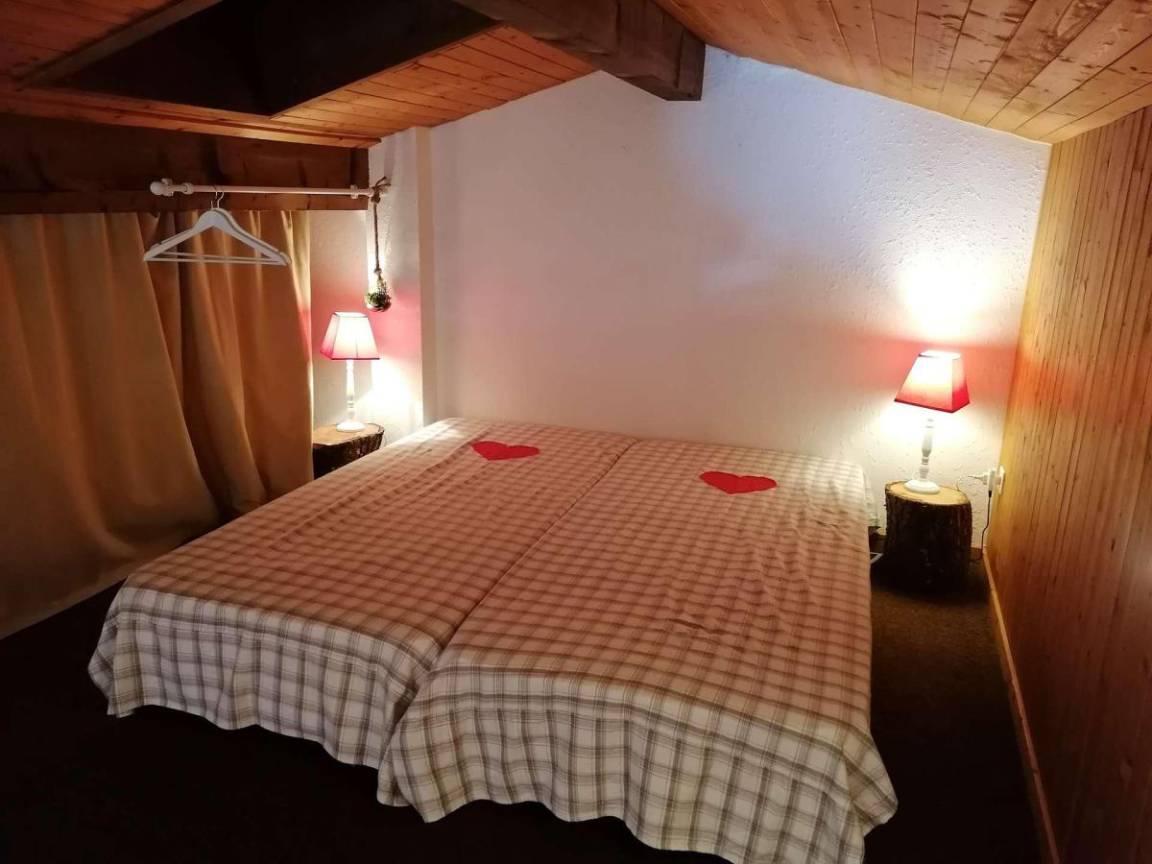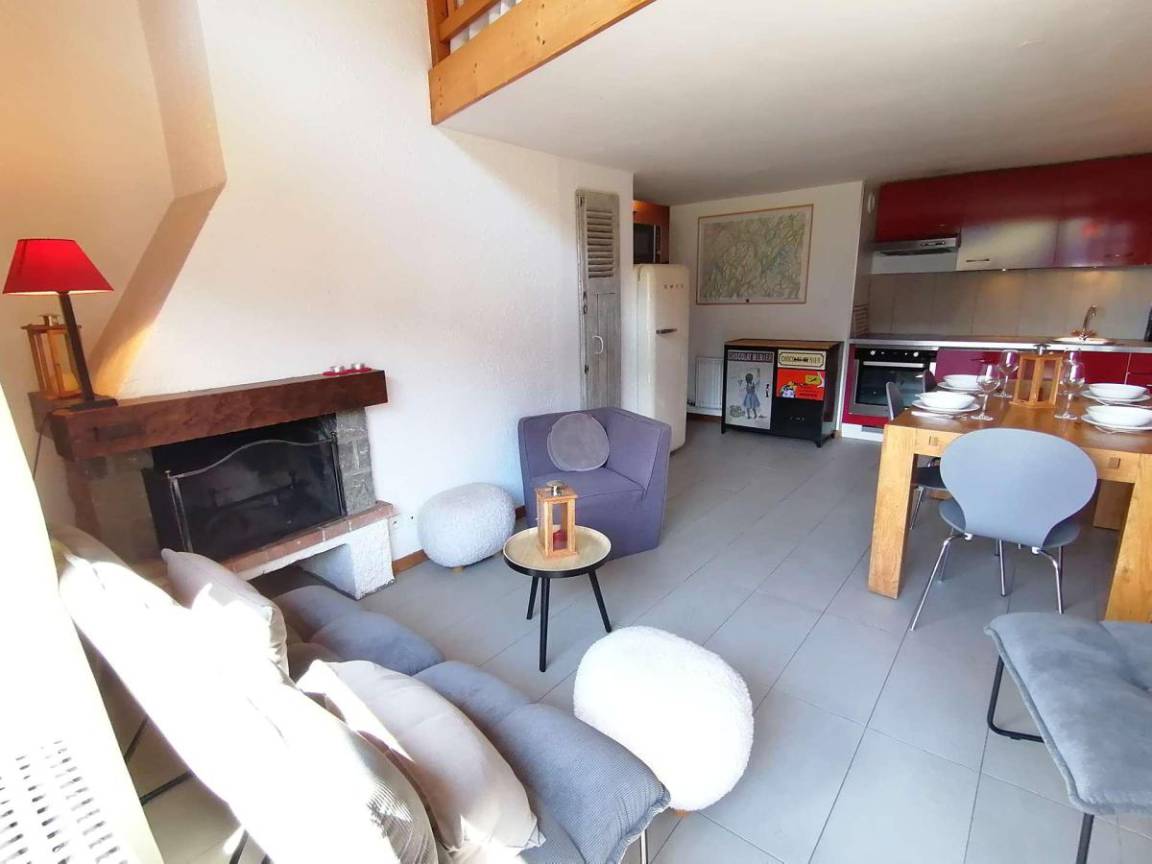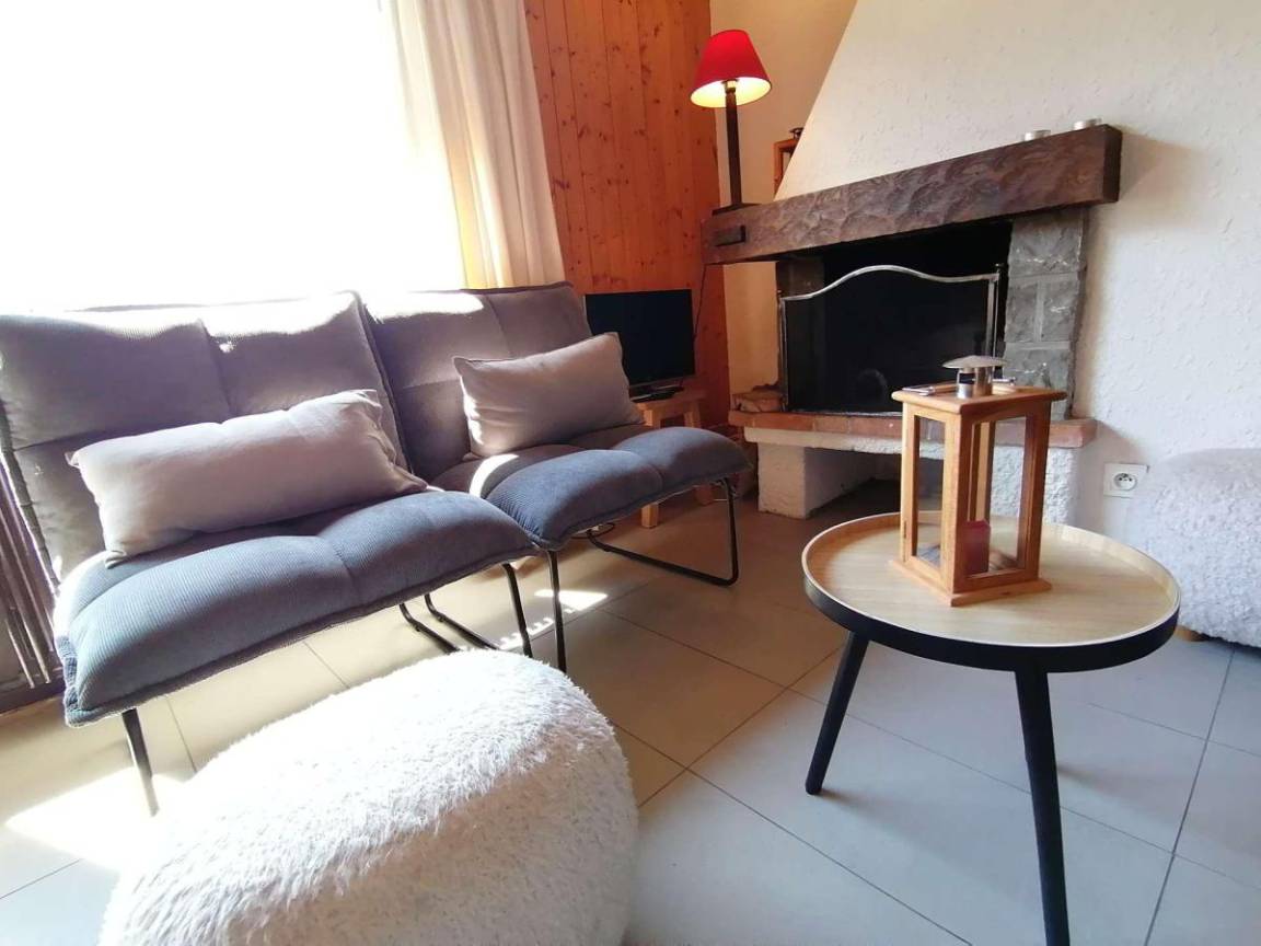 Fläche von ungefähr 72 m². 3te Etage. Orientierung : Süd. Blick berg und Dorf. Wohnzimmer mit Kamin (décorative), Sessel. Schlafzimmer mit Doppelbett (180*200). Schlafzimmer mit Einzelbett, 2 Stockbetten, . Zwischengeschoss mit 2 Einzelbetten. Kochnische mit Wasserkocher, Kaffeemaschine (à filtre), Backofen, Geschirrspülmaschine, Mikrowellenherd, 2 Glaskeramikkochfelder, Kühlschrank. Badezimmer mit Badewanne, Waschmaschine. separates WC. Balkon mit Gartentisch und -stühle. Die oberen Betten sind nicht für Kinder unter 6 Jahren geeignet.