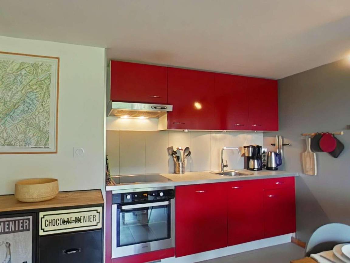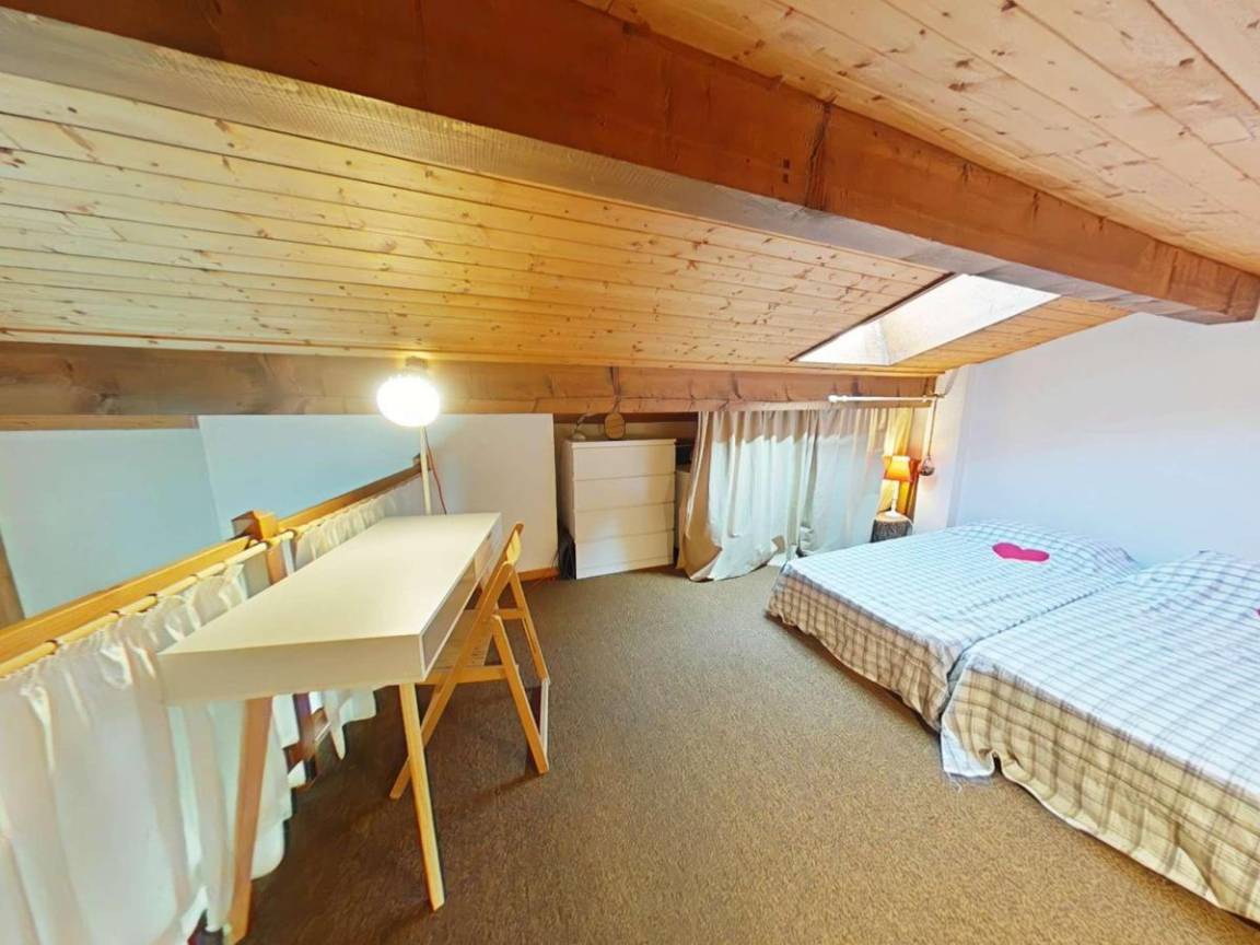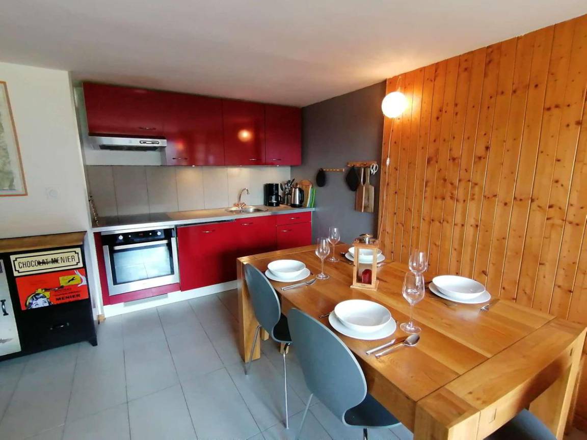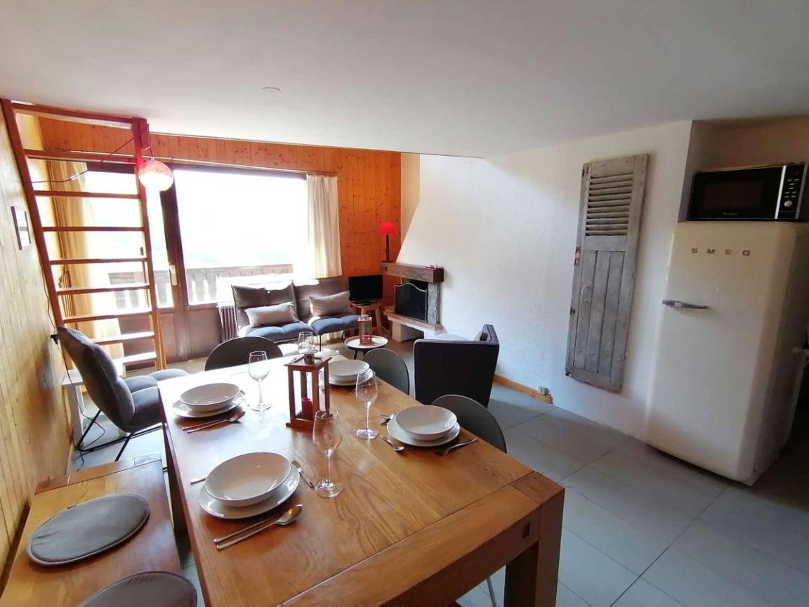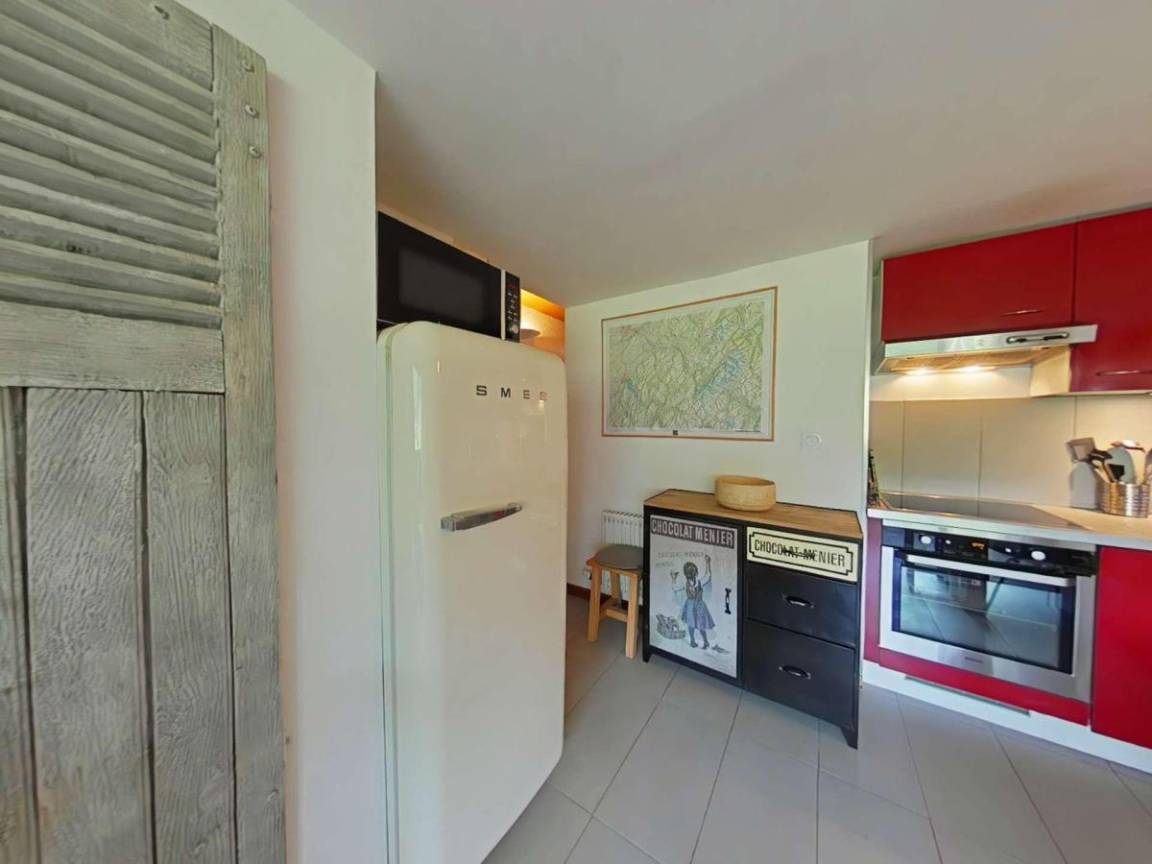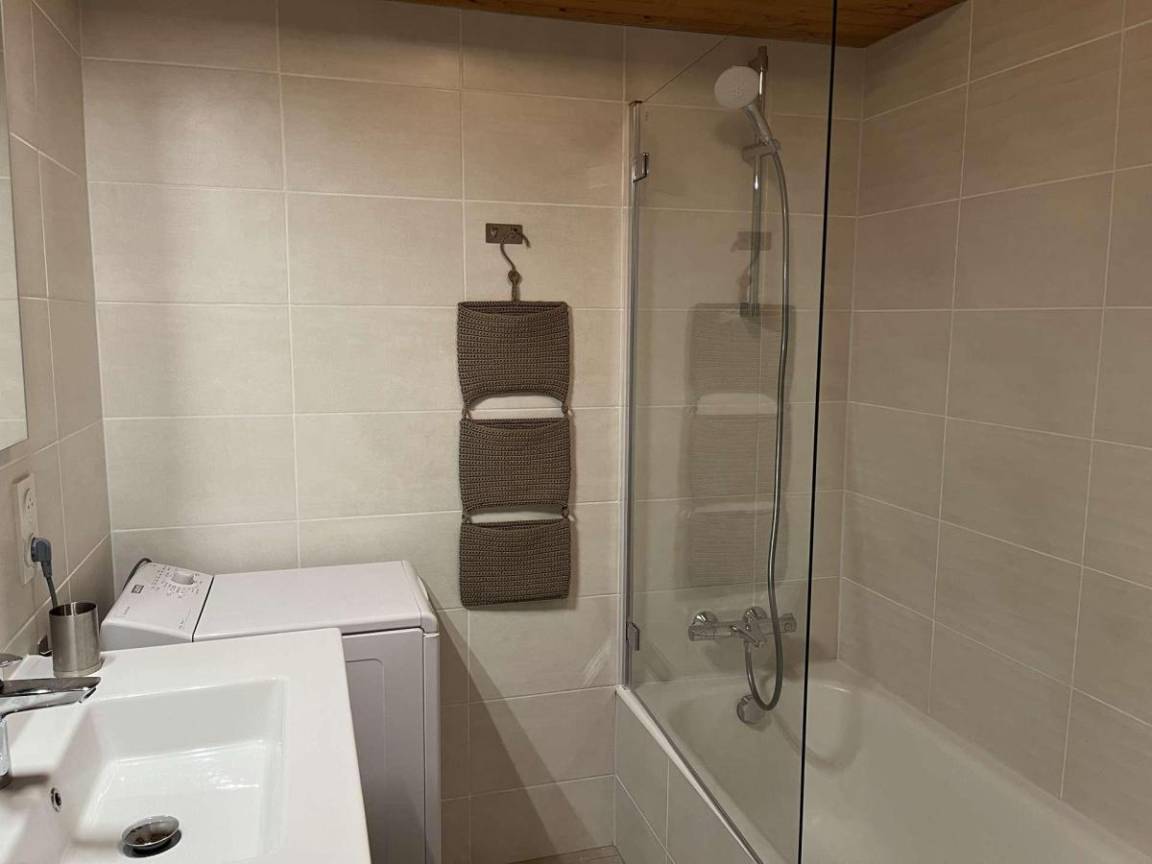 Fläche von ungefähr 72 m². 3te Etage. Orientierung : Süd. Blick berg und Dorf. Wohnzimmer mit Kamin (décorative), Sessel. Schlafzimmer mit Doppelbett (180*200). Schlafzimmer mit Einzelbett, 2 Stockbetten, . Zwischengeschoss mit 2 Einzelbetten. Kochnische mit Wasserkocher, Kaffeemaschine (à filtre), Backofen, Geschirrspülmaschine, Mikrowellenherd, 2 Glaskeramikkochfelder, Kühlschrank. Badezimmer mit Badewanne, Waschmaschine. separates WC. Balkon mit Gartentisch und -stühle. Die oberen Betten sind nicht für Kinder unter 6 Jahren geeignet.