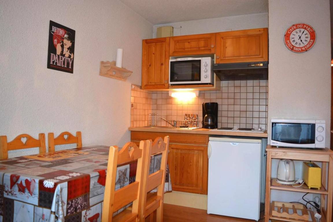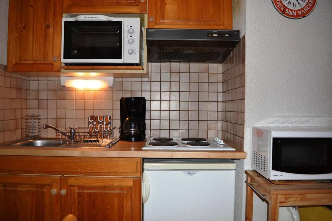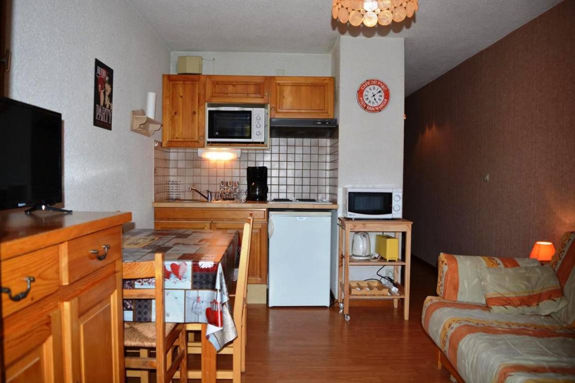 Fläche von ungefähr 27 m². Etage -2. Orientierung : Süd. Blick skipisten. Wohnzimmer mit Klappschlafcouch, TV. Alkoven mit 2 Stockbetten. Kochnische mit Fonduegerät, Wasserkocher, Kaffeemaschine (filtres), Backofen, Toaster, Mikrowellenherd, 2 Glaskeramikkochfelder, Kühlschrank. Badezimmer mit Haartrockner, Handtuchtrockner, WC. Balkon. Die oberen Betten sind nicht für Kinder unter 6 Jahren geeignet.