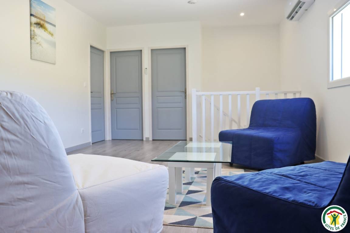 Obergeschoss: Ein zum Wohnzimmer umgebauter Flur mit TV-Lounge, Klimaanlage (warm/kalt) und drei Schlafsofas (3 x 90 cm), drei Schlafzimmer, zwei davon im Dachgeschoss. Jedes Schlafzimmer verfügt über zwei Einzelbetten, die zu einem Doppelbett (2 x 90 cm oder 1 x 180 x 200 cm) zusammengestellt werden können, ein Duschbad und ein WC.