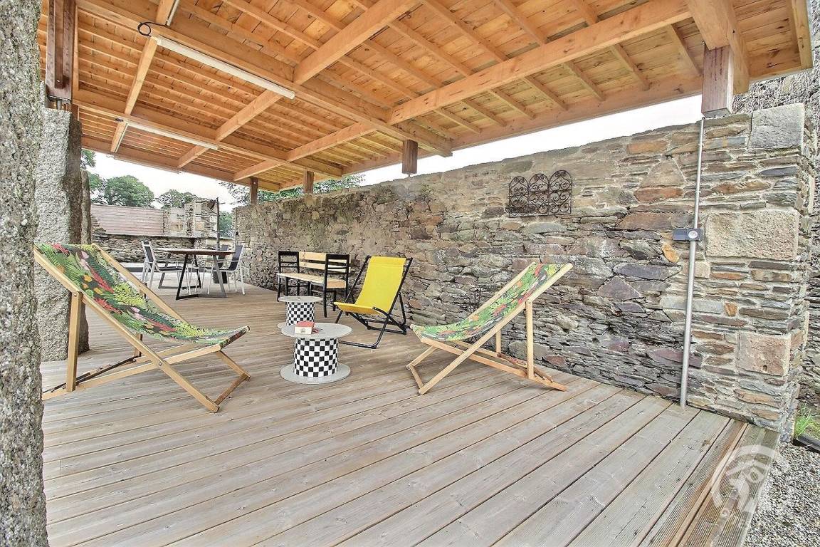Private Terrasse im Innenhof von 55 m² mit Blick auf die Gîte, mit Gartenmöbeln, Ruhelounge und Liegestühlen.