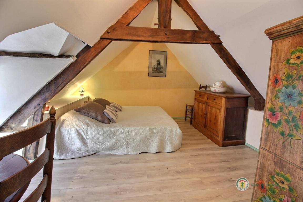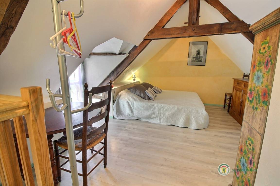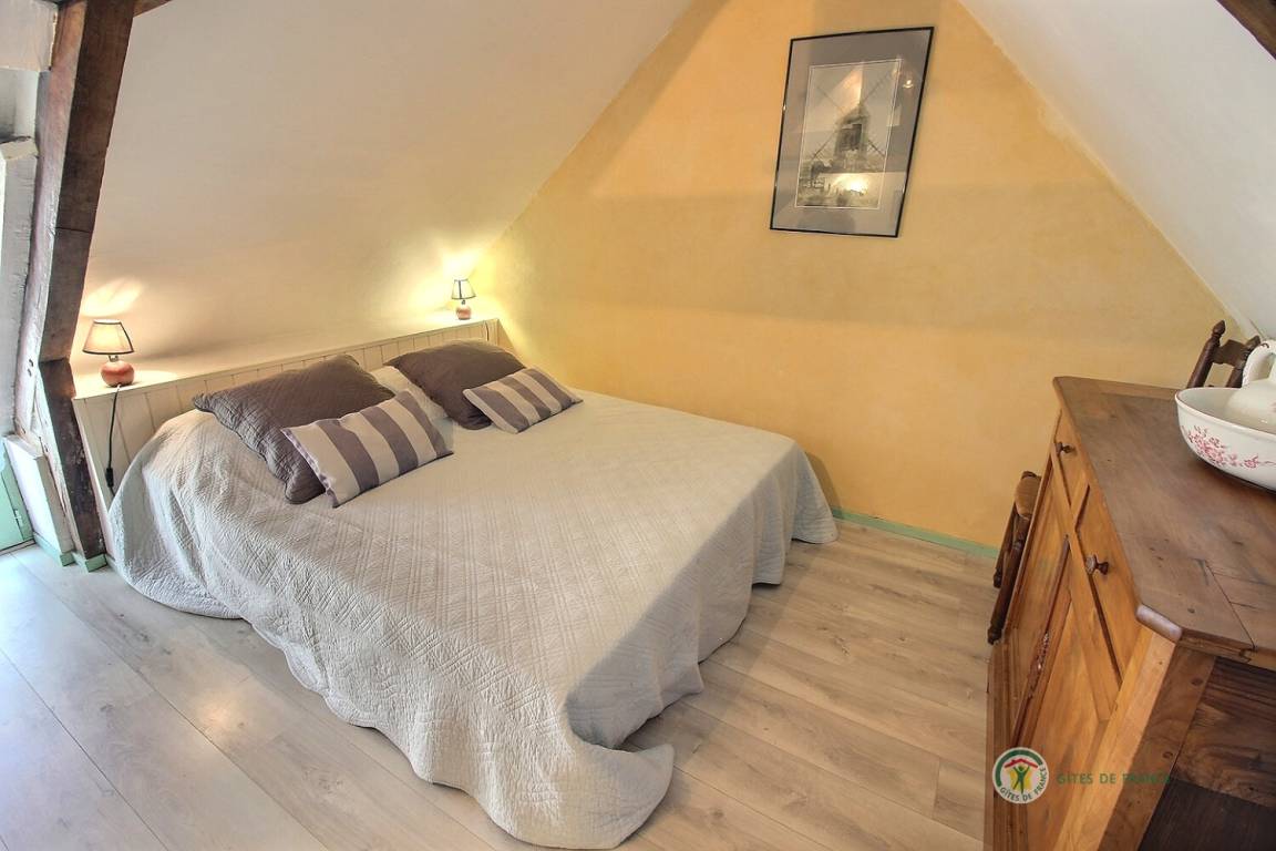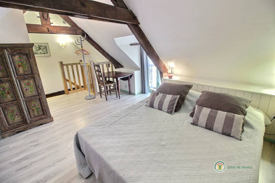 - Erster Stock: Schlafzimmer für zwei Personen (160x200 Bett) mit Sichtbalken, Badezimmer mit Dusche.