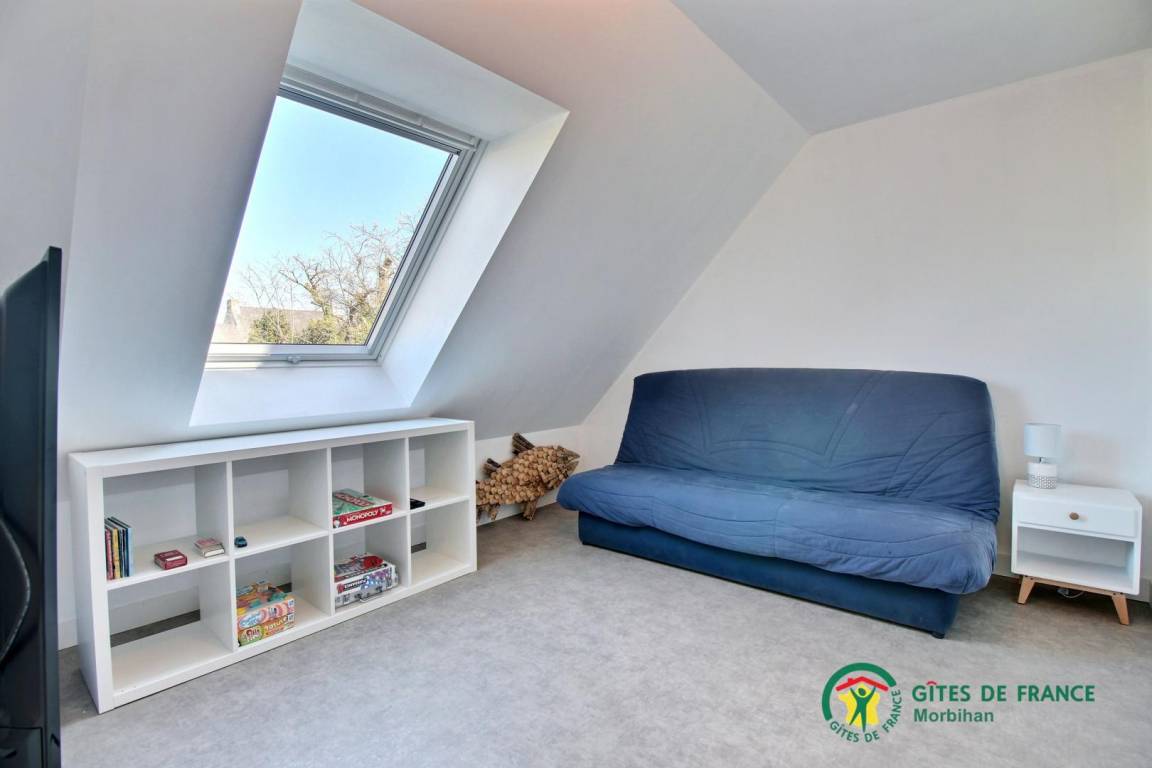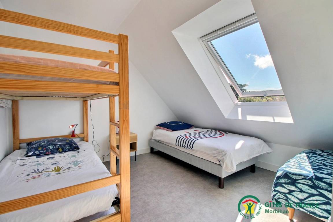 - Obergeschoss: 2 Schlafzimmer (jedes mit 1 160-cm-Bett, umwandelbar in 80-cm-Betten), 1 Schlafzimmer für 4 Personen (4 90-cm-Betten, darunter 1 Etagenbett), ein Wohnzimmer mit Fernseher, ein Badezimmer und eine separate Toilette.