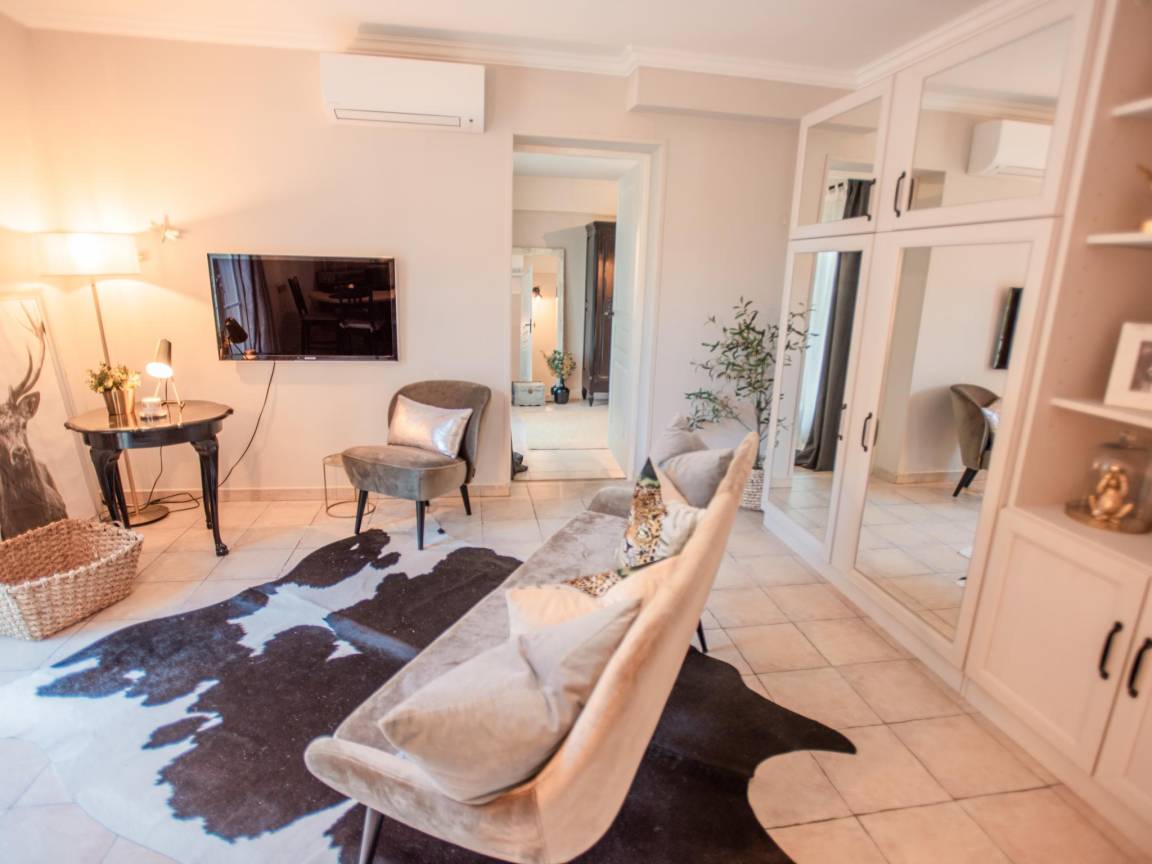 Parterre(privater Eingang): Wohnzimmer mit Schrankbett für 2 Personen, TV, Sitzecke, Klimaanlage , offene Küche mit Esstisch, Wasserkocher, Kochherd, Kaffeemaschine(cups), Mikrowelle, Geschirrspüler, Kühl-/Gefrierkombination , Schlafzimmer mit Doppelbett(180 x 200 cm), Klimaanlage , Badezimmer mit Dusche, Toilette