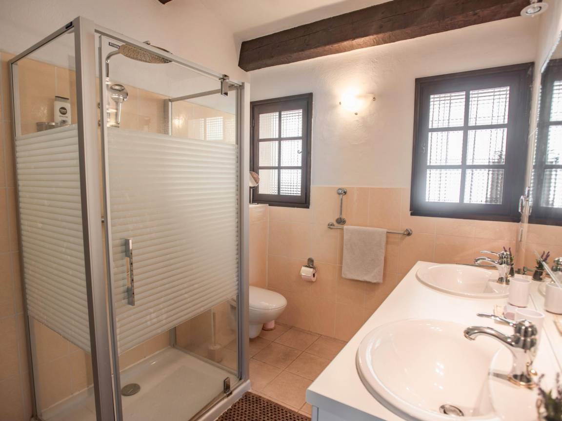 Layout : Parterre: offene Küche mit Wasserkocher, Toaster, Kochherd(4 Kochplatten, Ceranfeld), Dunstabzugshaube, Kaffeemaschine(cups), Backofen(elektrisch), Mikrowelle, Geschirrspüler, 2x Kühl-/Gefrierkombination , Wohn/Esszimmer mit TV(Flatscreen, Satellit), Esstisch, Kamin, Sitzecke, DVD-Player , Schlafzimmer mit Doppelbett(180 x 200 cm), Klimaanlage , Schlafzimmer mit Einzelbett(90 x 190 cm), Doppelbett(160 x 200 cm), Klimaanlage , Schlafzimmer mit Doppelbett(140 x 200 cm), Klimaanlage , Schlafzimmer mit 2x Einzelbett(90 x 190 cm) , Badezimmer mit Dusche(Kabine, Regen), 2x Waschbecken, Toilette , Badezimmer mit Dusche(ebenerdige Dusche), Waschbecken , Toilette mit Waschbecken, Toilette , Wirtschaftsraum mit Wäschetrockner, Waschmaschine