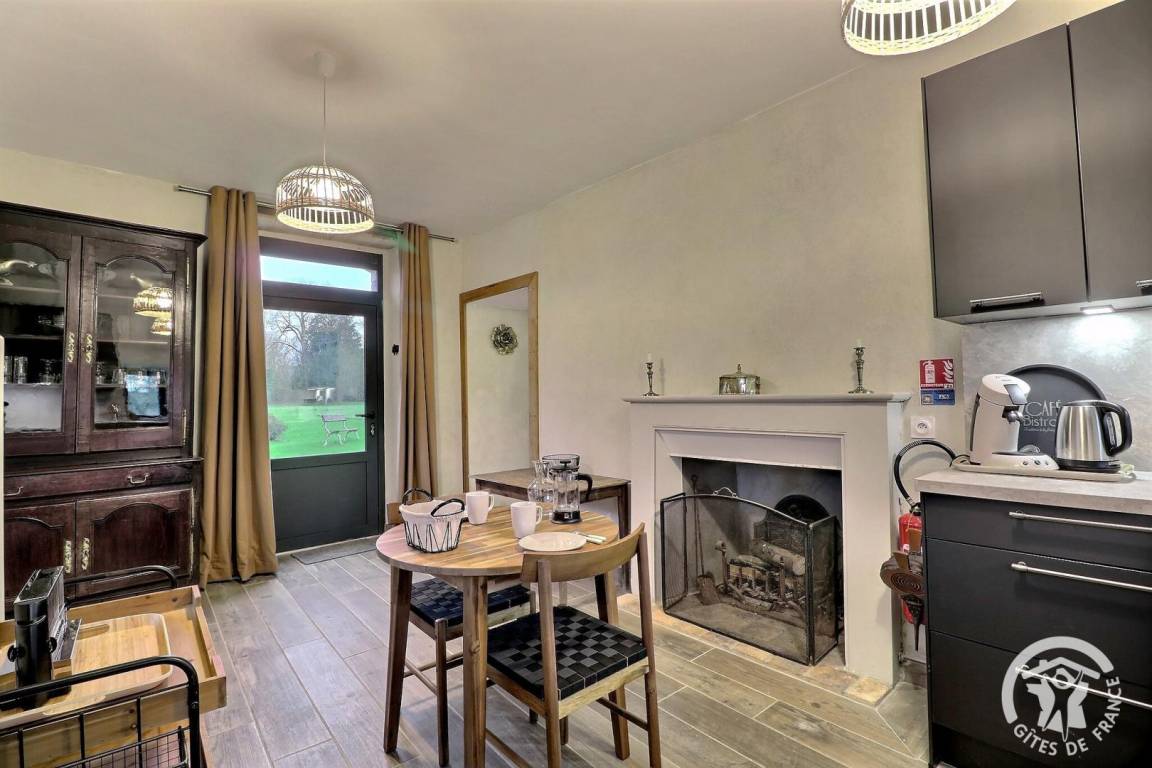 Ausgestattete Küche mit Kamin und Zugang zu einem Flurschlafzimmer im Obergeschoss.