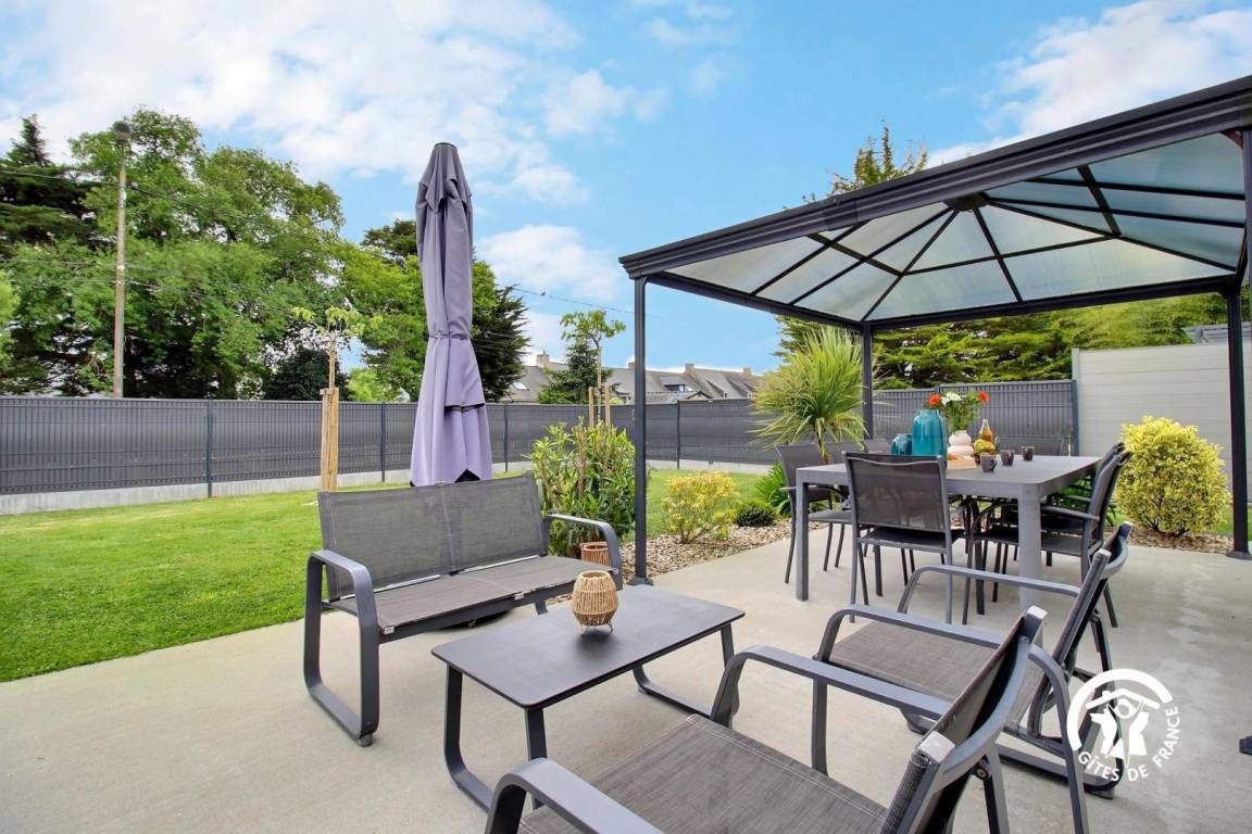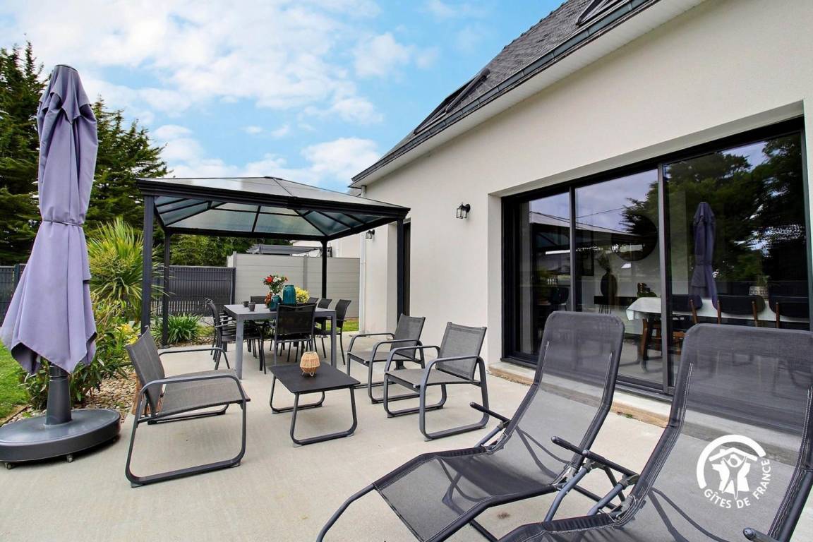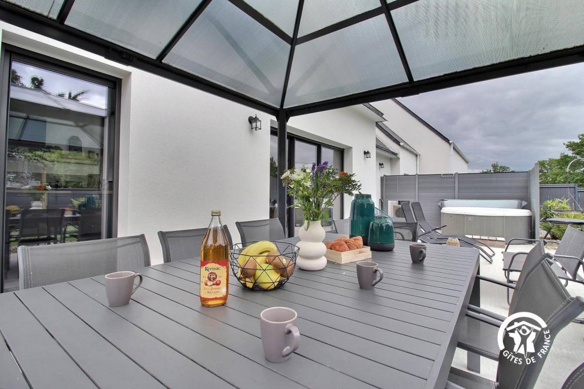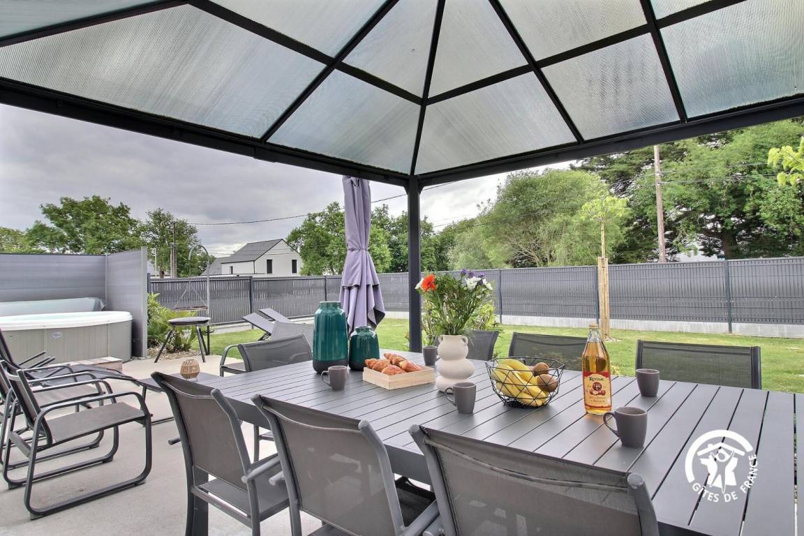 - Terrasse mit ganzjährig zugänglichem 4-Sitzer-Spa, Esstisch, Gartenmöbeln, Liegestühlen, Grill und Pergola.