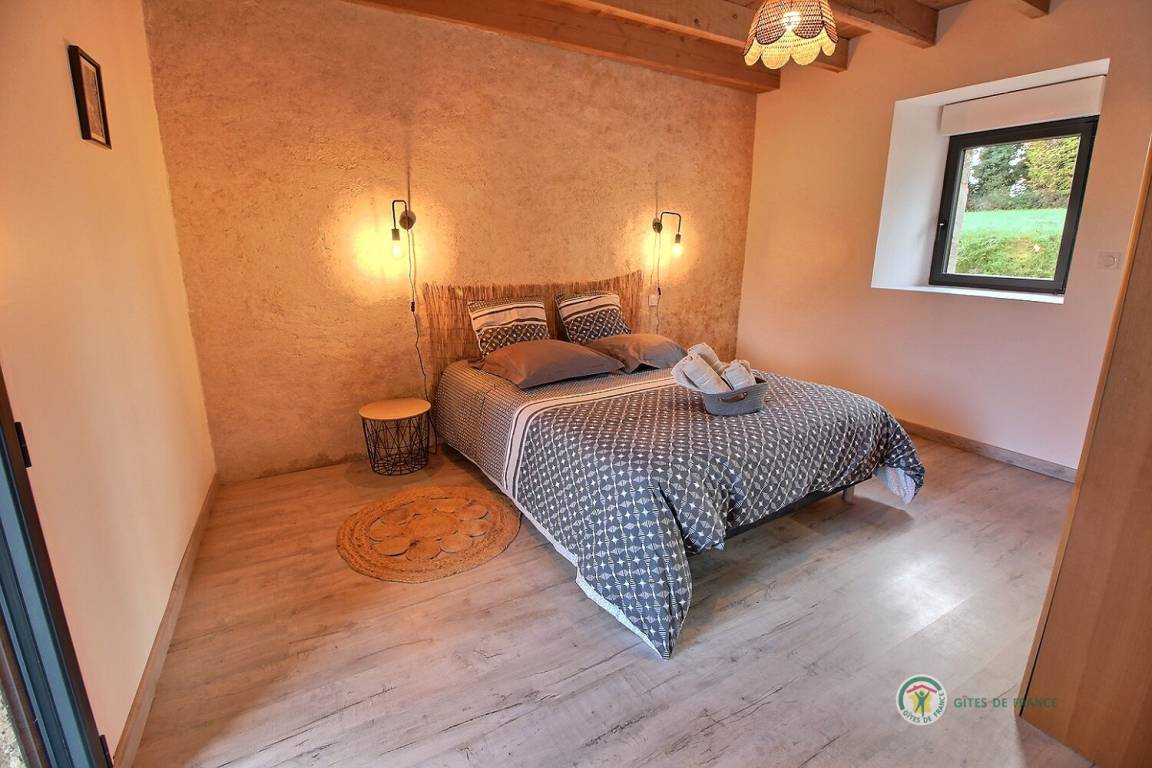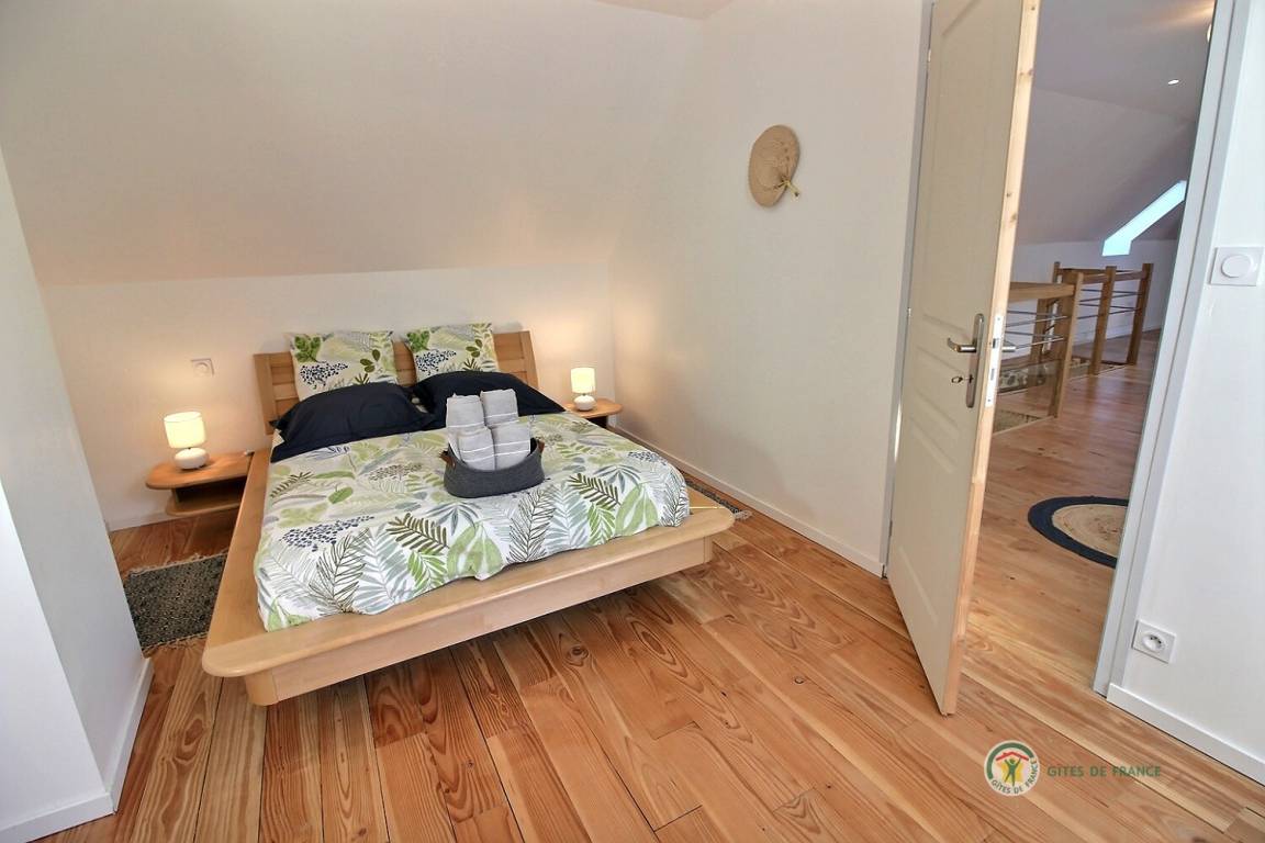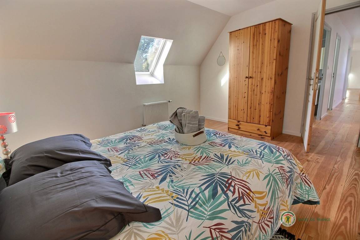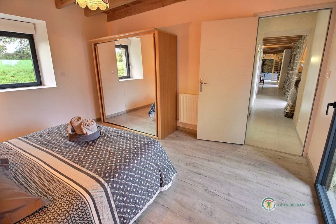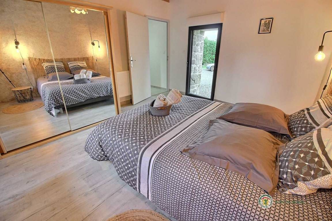 Ihre Ferienwohnung umfasst im Erdgeschoss: ein großes Wohnzimmer von mehr als 67 m² mit Küche, Wohnzimmer, Wohnzimmer mit Holzofen, 1 Schlafzimmer mit 1 Bett 160x200, in einer kleinen Nische eine steile Treppe mit Zugang zu 1 Schlafzimmer mit 1 Bett 140x190, separate Toilette mit Waschbecken, Badezimmer mit Dusche. Obergeschoss: ein großes Zwischengeschoss, 3 Schlafzimmer mit 2 Betten 160x200, 1 Bett 140x190 und 2 Betten 90x190, Badezimmer mit Dusche, separates WC. Die Heizung dieser Gîte wird von einem automatischen Holzkessel geliefert. Hof von 600 m², eine Rasenfläche von 2000 m² und eine Terrasse auf der Südseite von 90 m². Dieses Cottage ist im Erdgeschoss für eine Person mit eingeschränkter Mobilität zugänglich.