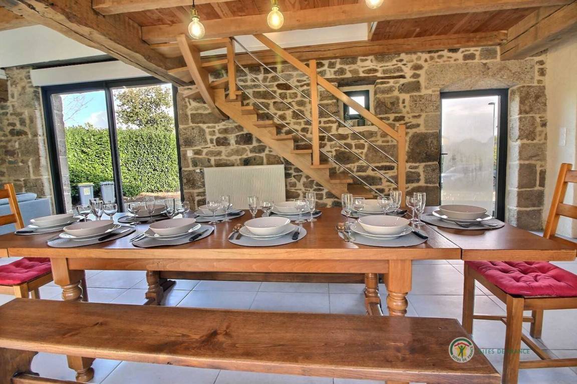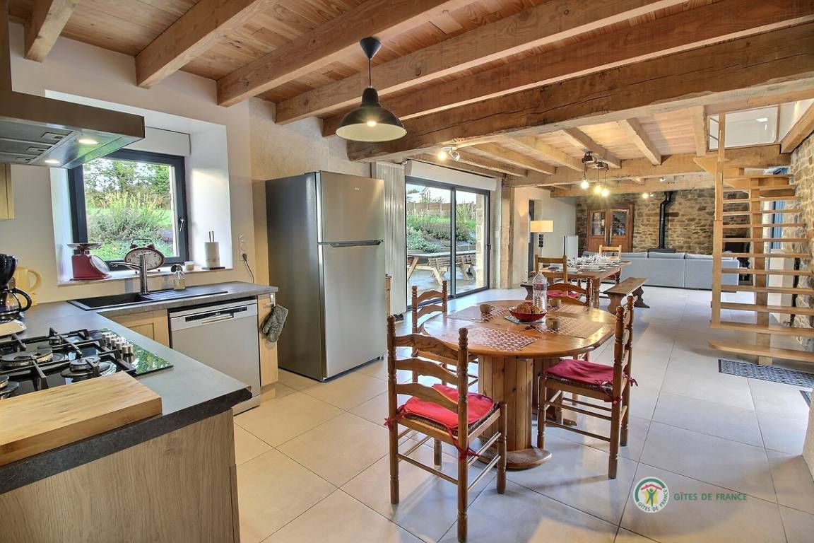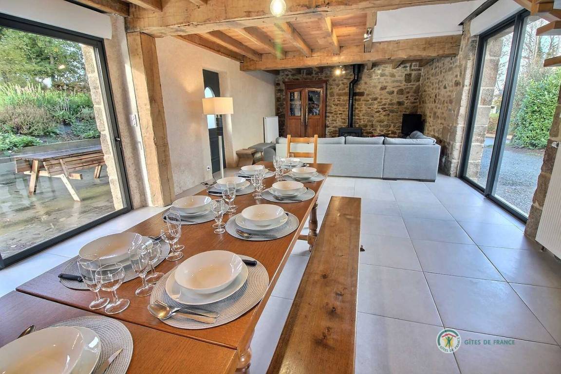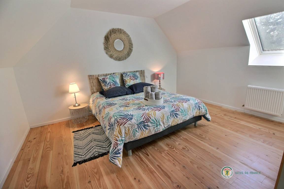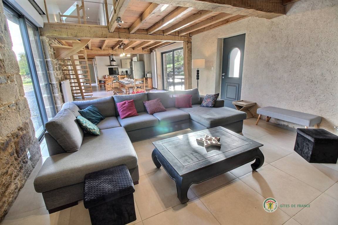 Ihre Ferienwohnung umfasst im Erdgeschoss: ein großes Wohnzimmer von mehr als 67 m² mit Küche, Wohnzimmer, Wohnzimmer mit Holzofen, 1 Schlafzimmer mit 1 Bett 160x200, in einer kleinen Nische eine steile Treppe mit Zugang zu 1 Schlafzimmer mit 1 Bett 140x190, separate Toilette mit Waschbecken, Badezimmer mit Dusche. Obergeschoss: ein großes Zwischengeschoss, 3 Schlafzimmer mit 2 Betten 160x200, 1 Bett 140x190 und 2 Betten 90x190, Badezimmer mit Dusche, separates WC. Die Heizung dieser Gîte wird von einem automatischen Holzkessel geliefert. Hof von 600 m², eine Rasenfläche von 2000 m² und eine Terrasse auf der Südseite von 90 m². Dieses Cottage ist im Erdgeschoss für eine Person mit eingeschränkter Mobilität zugänglich.