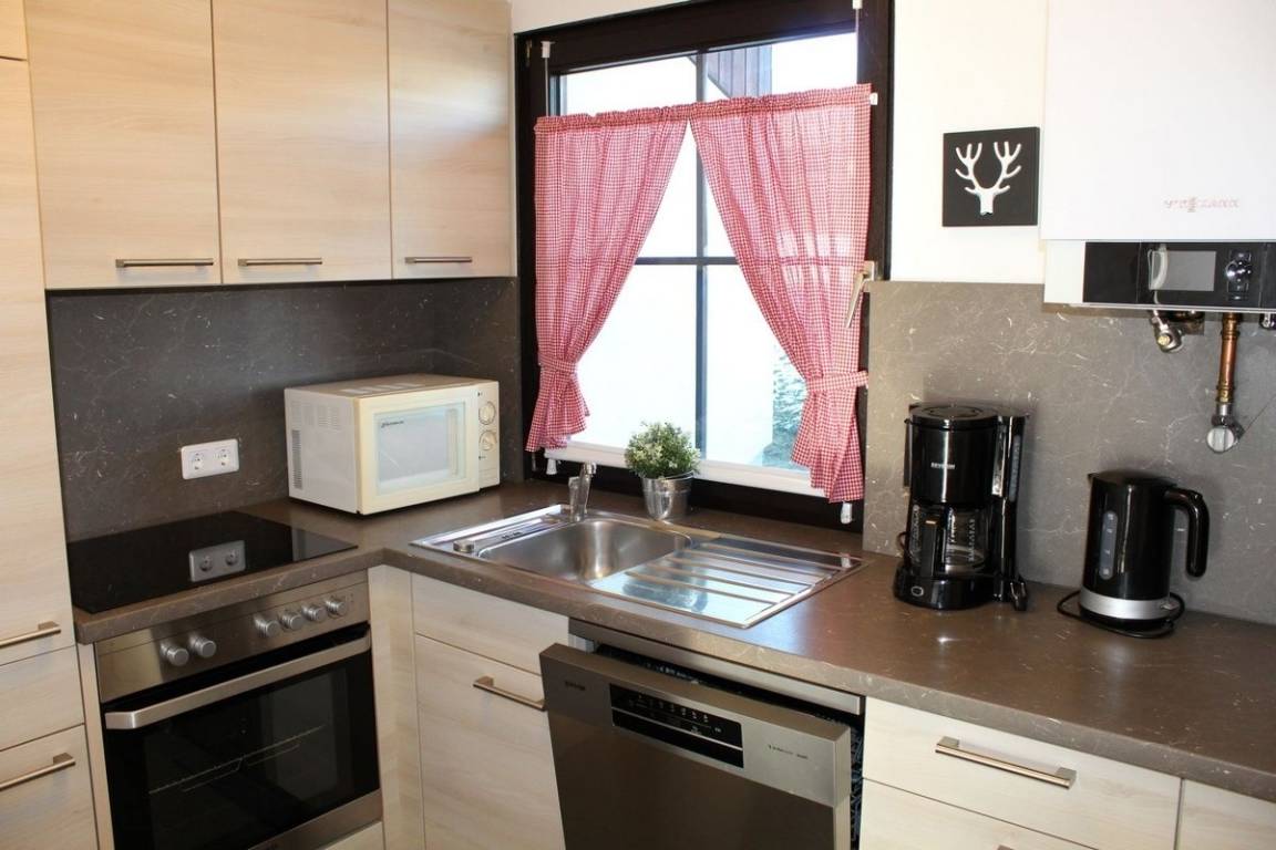 Voll ausgestattete Küche: Kühlschrank mit Gefrierfach, Herd (Cerankochfeld), Backofen, Wasserkocher, Toaster, Kaffeemaschine, Besteck, Geschirr, Gläser, Töpfe und alle gebräuchlichen Küchenutensilien.