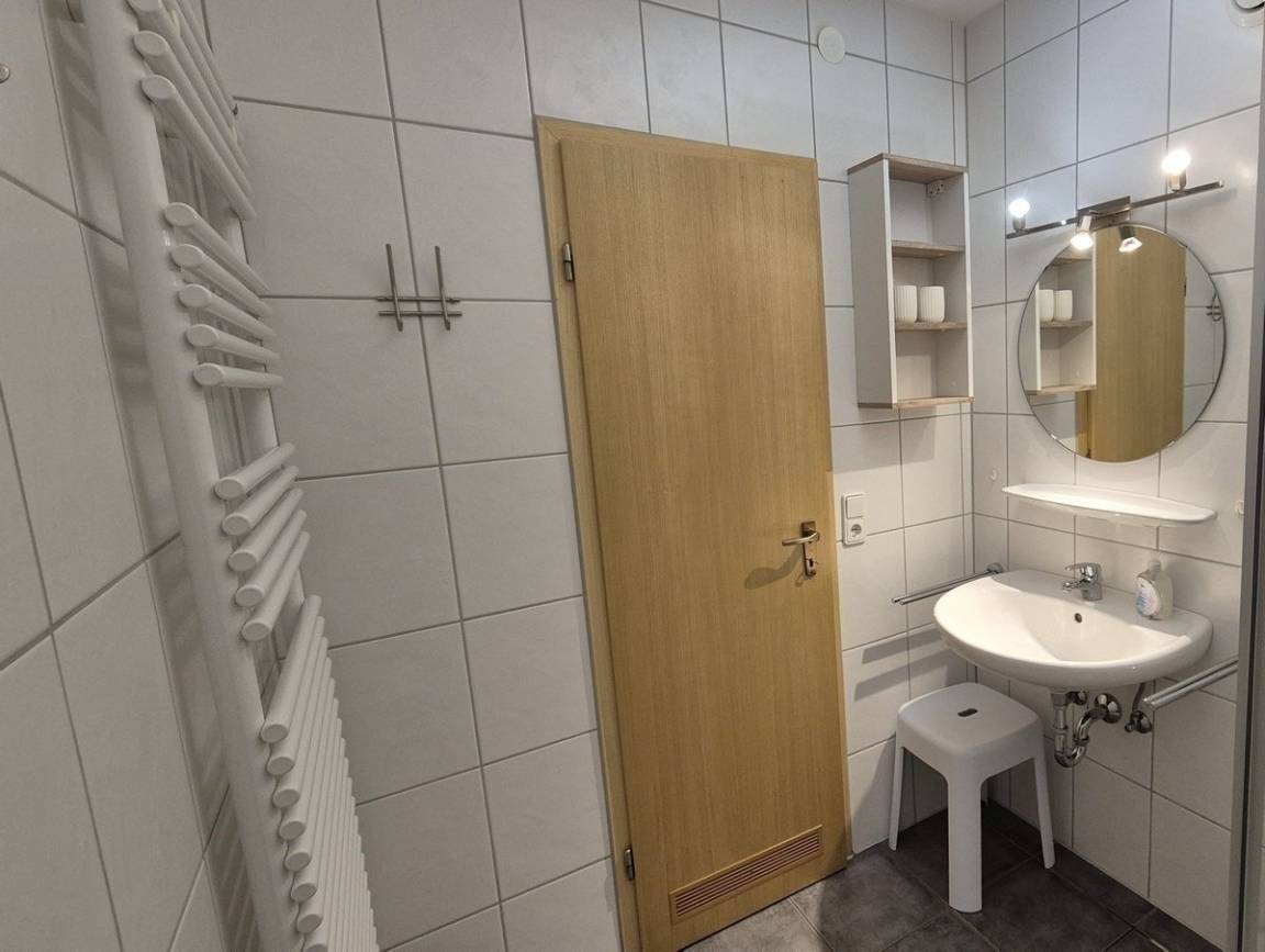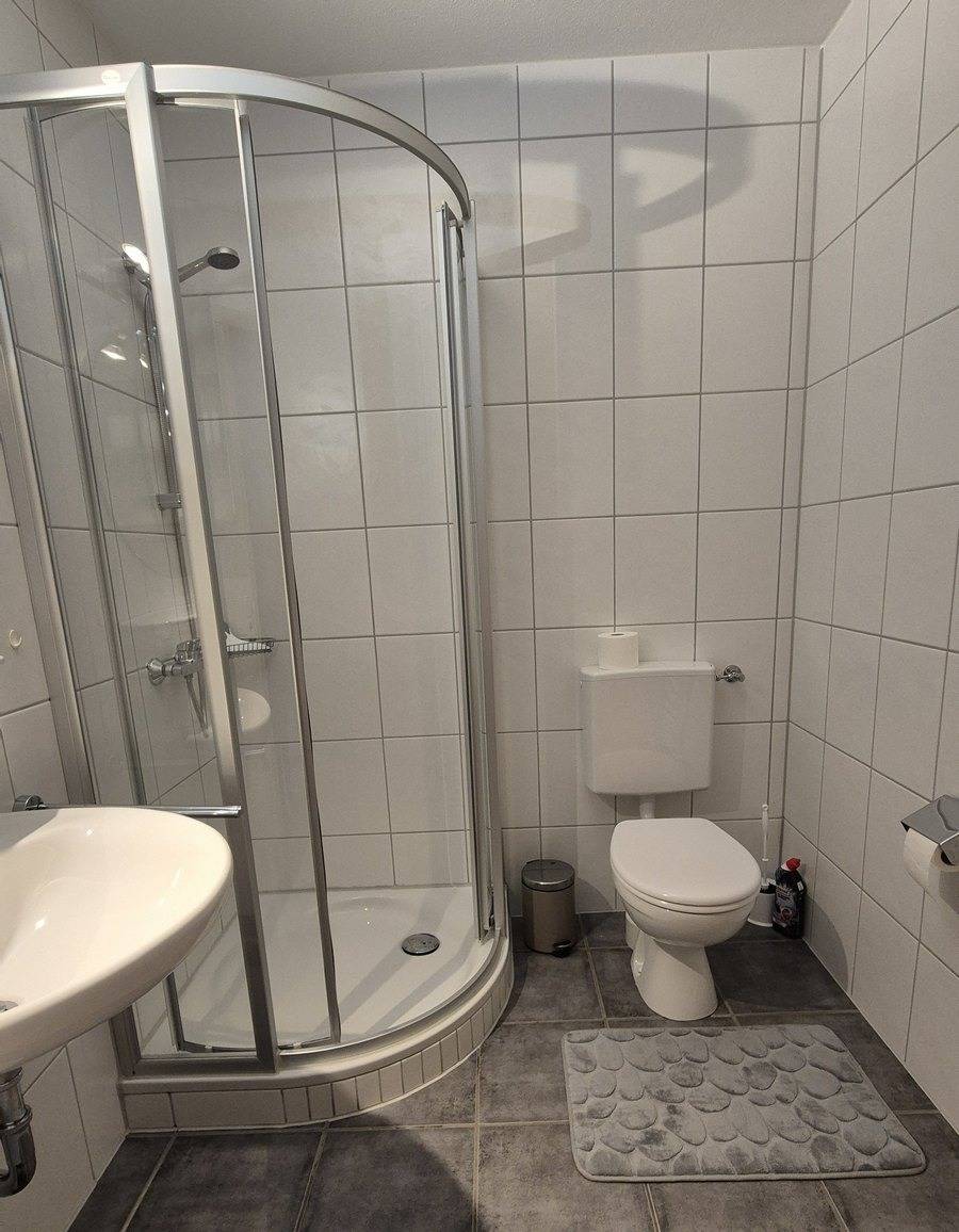 Badezimmer: Dusche, WC und Waschtisch