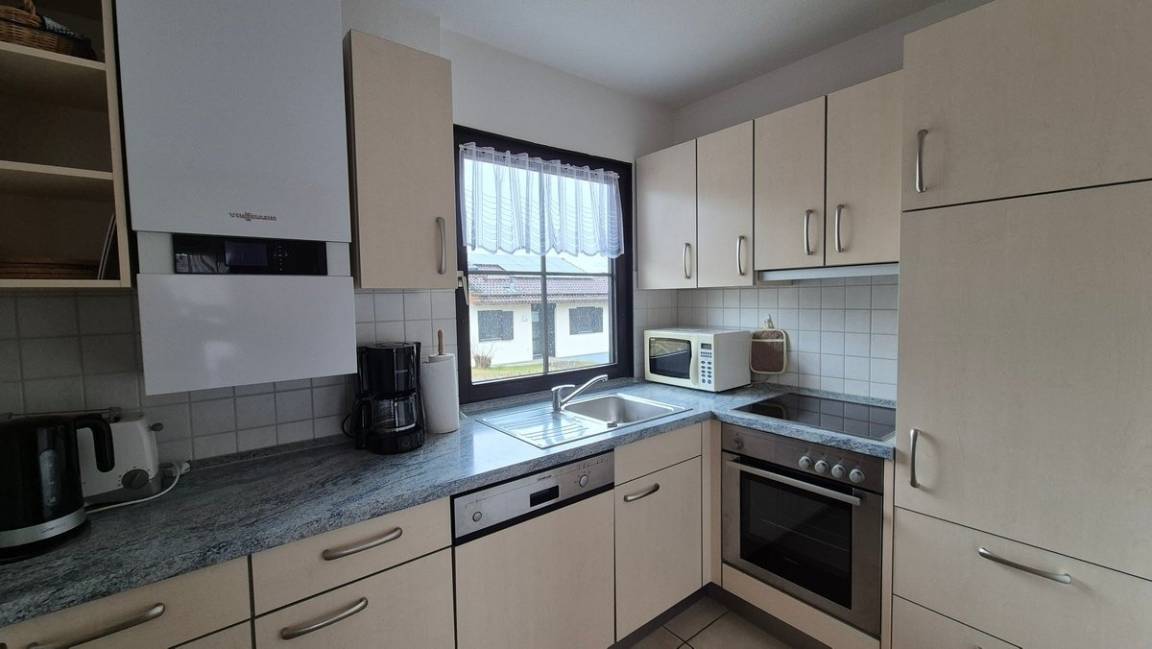 Küche: Spülmaschine, Elektroherd, Backofen, Kühlschrank mit Gefrierfach, Mikrowelle, Kaffeemaschine, Wasserkocher, Toaster