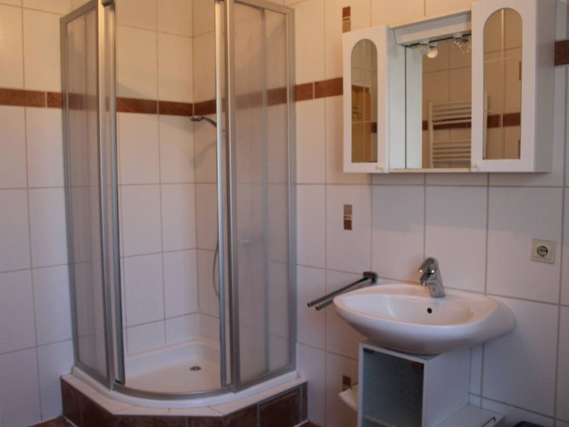 Badezimmer: Eck-Badewanne, Dusche, WC und Waschtisch, breite Badezimmertüre
