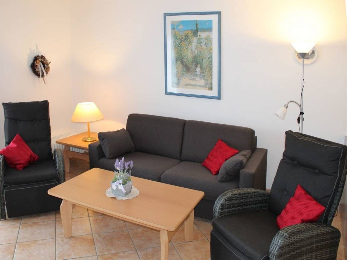 Das freundliche, helle Wohnzimmer lädt ein, sich wohl zu fühlen. Die gemütliche Sitzgruppe mit ausziehbarer Couch bietet Platz für alle Gäste.Ein Flachbild-Fernseher und Radio (Musikanlage) gehören ebenfalls zur Ausstattung dieses Hauses. Vom Wohnzimmer aus gelangen Sie direkt auf Ihre Terrasse. Auf der Terrasse ist das Grillen (mit eigenem Grill) erlaubt.Der direkt angrenzende Essbereich bietet Platz für Ihre gemeinsamen Mahlzeiten und gemütliche Abende.